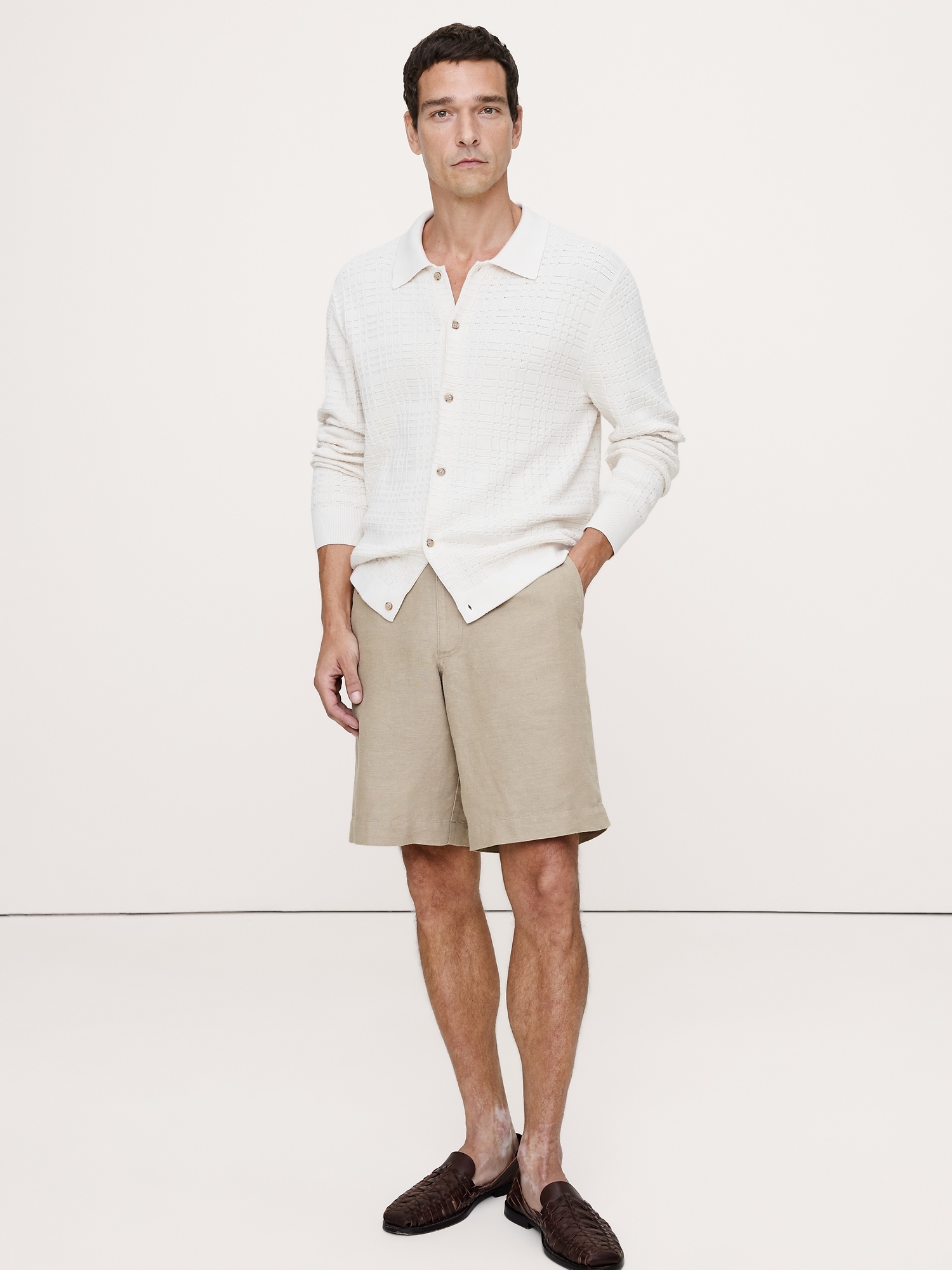 Cut from soft linen and cotton, these tailored shorts have an elastic waistband at back and a fully functional fly.