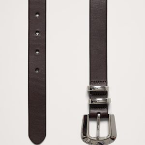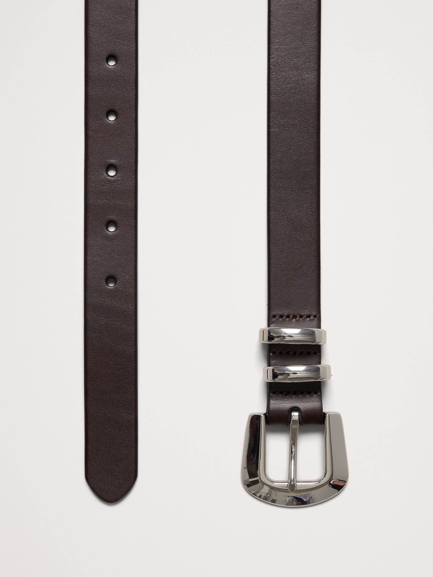 Designed and fitted to be worn on the hips, this skinny-width belt is crafted from a sturdy cut of leather and secured with a single buckle with beveled edges.