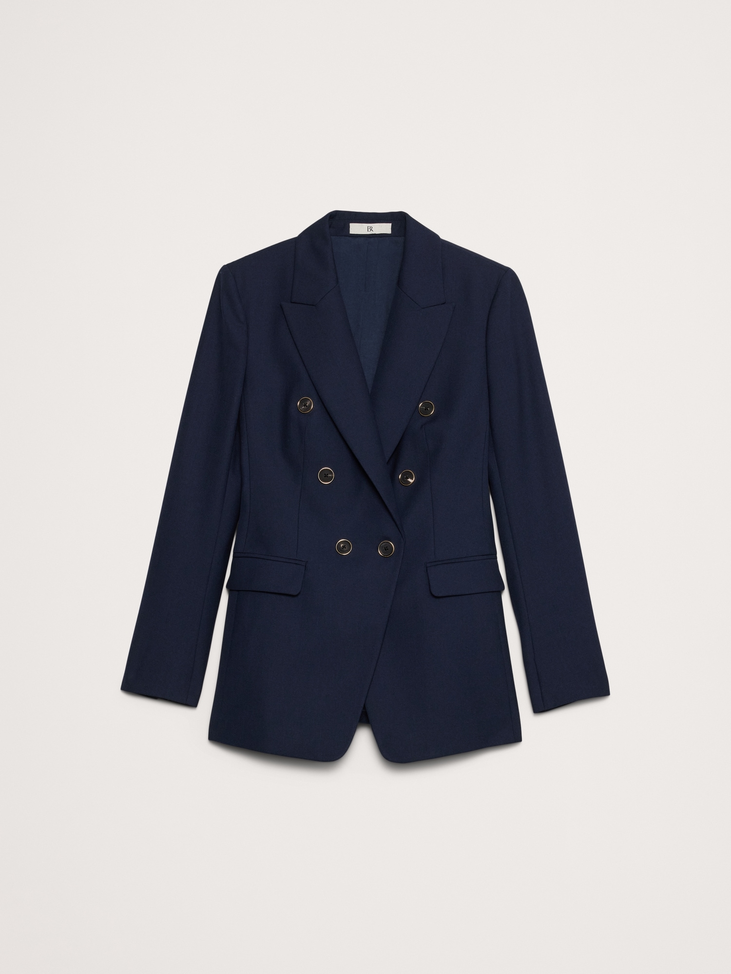 Peak lapel. Double-breasted gold crest button front.