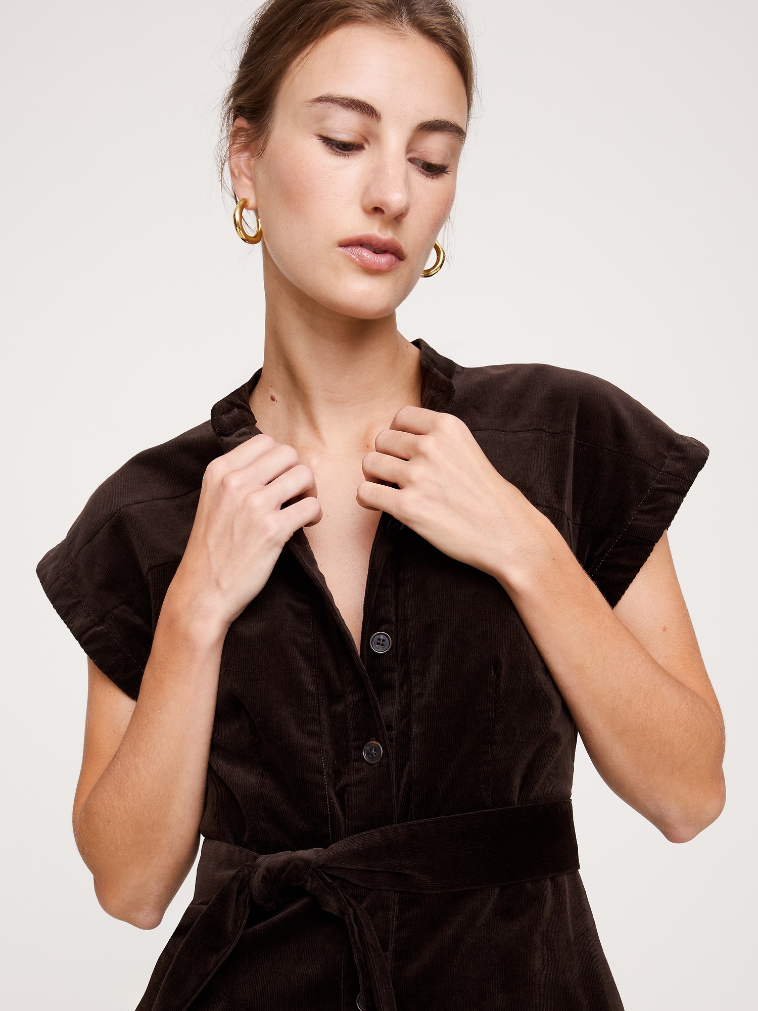 When it comes to a good shirt dress, no one does it quite like us. Here, we kept the silhouette clean with a banded collar—the better to show off this soft, fine-wale corduroy. Fit Flare: Fitted bust and waist with a flare skirt. Banded collar with button front. Belted waist. Front pockets. Side slits. Unlined. #817743