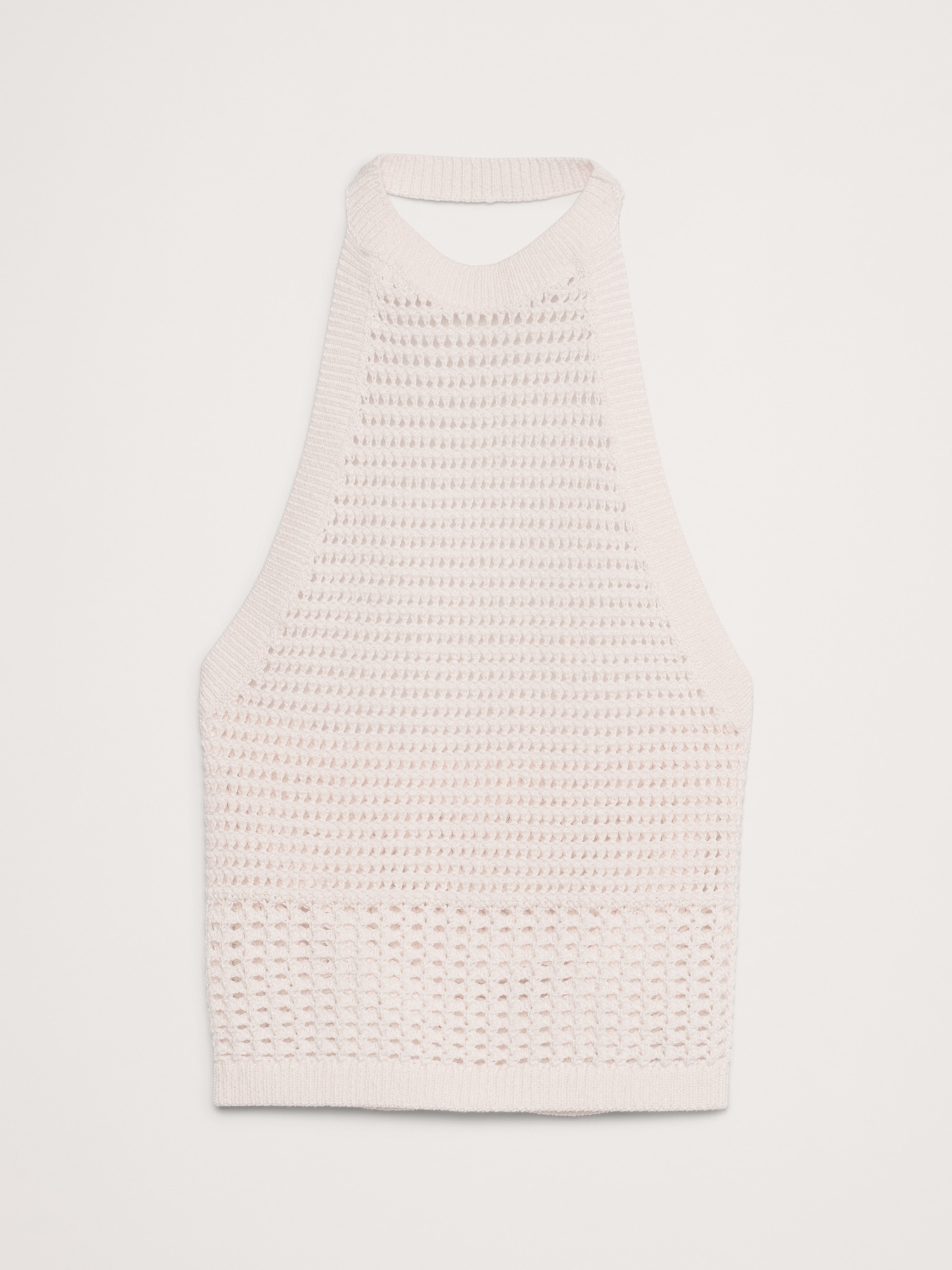 Our take on the season’s sheer trend, this halter top uses a mix of open, mesh-like stitches to mimic the look and feel of true crochet—in 100% cotton. Make it a set with the coordinating skirt.