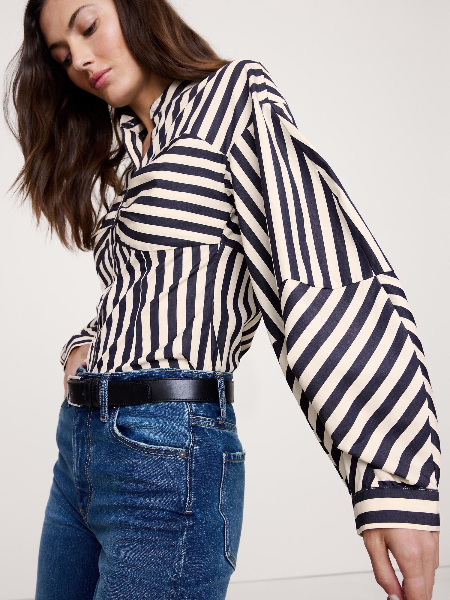 Deconstructed, reconstructed. This balloon-sleeve shirt nods at the season’s corset trend with a sweetheart bodice and corset-inspired panels at the waist—in our 100% cotton poplin.