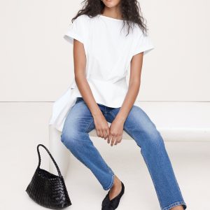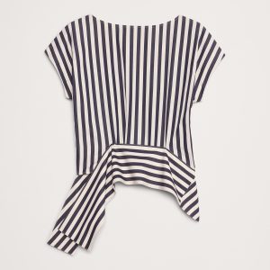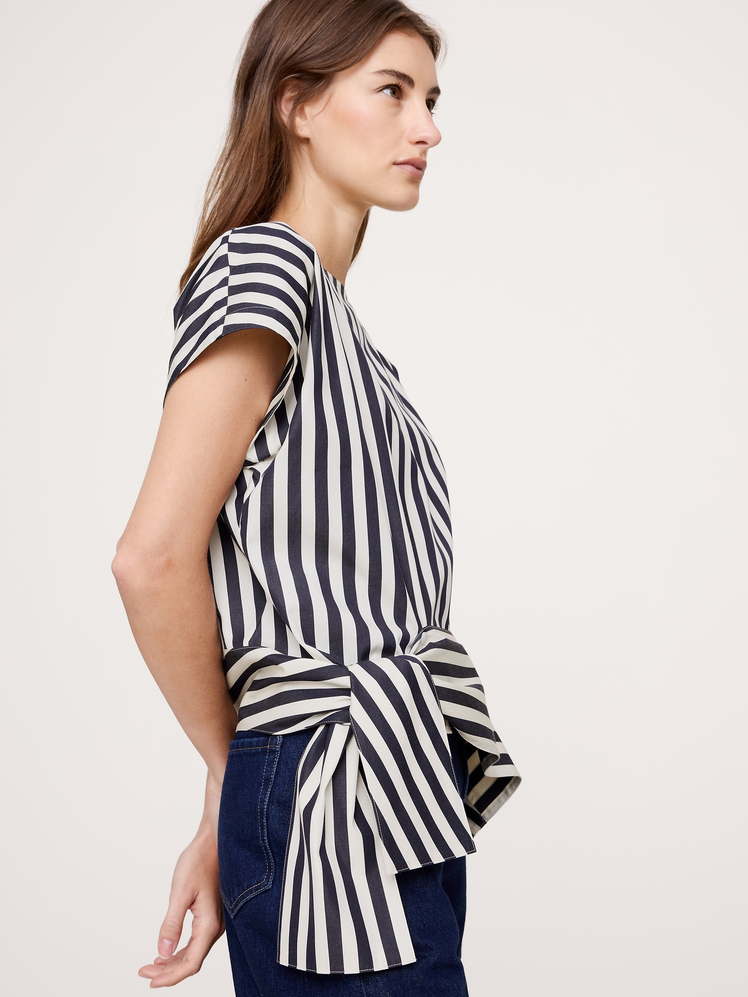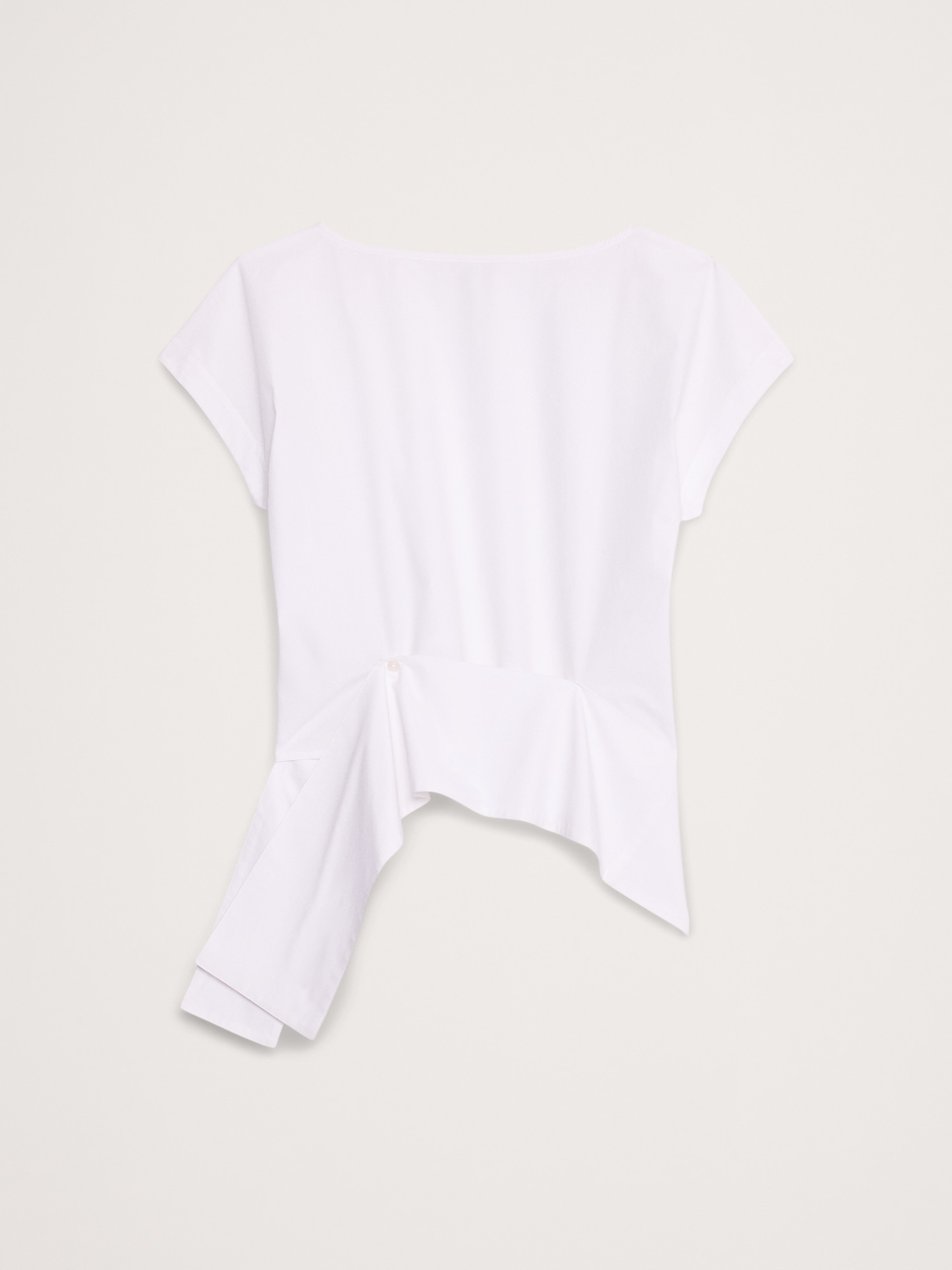 Deconstructed, reconstructed. This cotton poplin shirt borrows elements from the classic shirt, with a boatneck and asymmetrical hem twist. Let the bottom sash down or tie at the side to cinch the waist. Relaxed fit: Relaxed fit through shoulders, chest and waist. Boatneck. Button detail and asymmetrical hem. Unlined. #825954