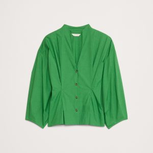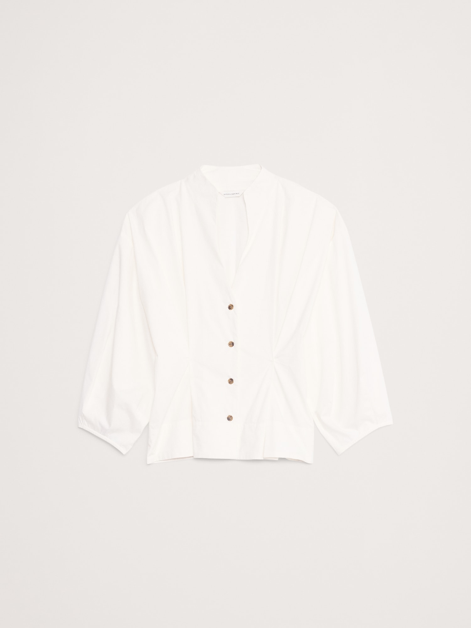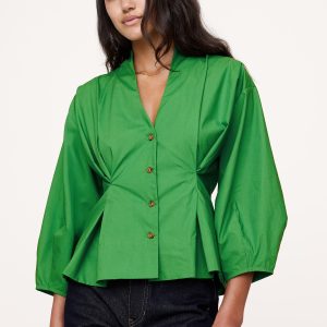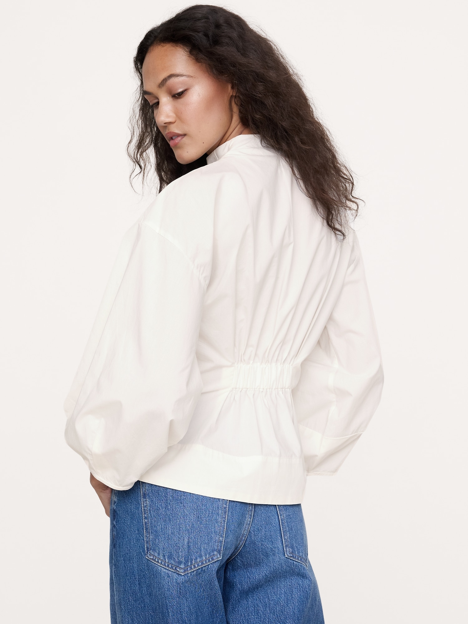 A fun and flirty take on the classic poplin shirt, this one has blouson sleeves here, as well as pleats at the waist and a cinched detail at back. Relaxed fit through shoulders, arms, and chest. Fitted waist and peplum hem. V-neck with button front. Cinched detail at back waist. Unlined. #833064