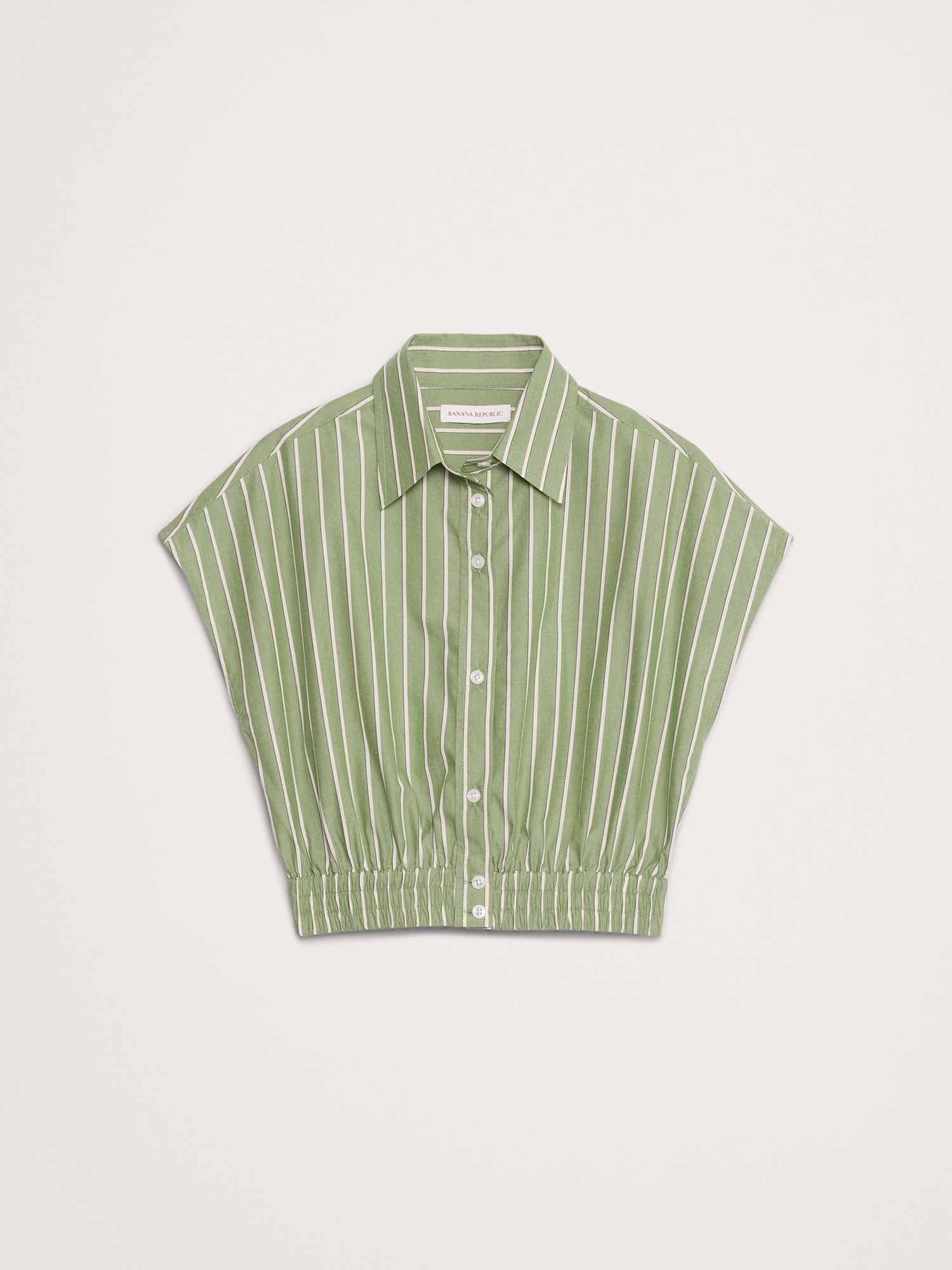 An invitation to play with proportions. This reimagined collared shirt has elastic at the hem and a tapered fit through the body that creates a sharp-shouldered silhouette.