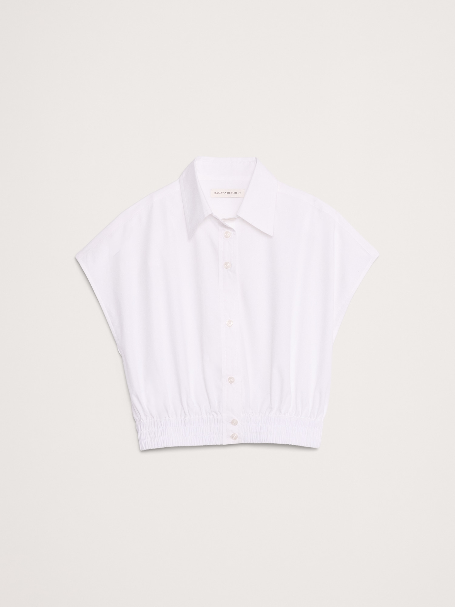An invitation to play with proportions. This reimagined collared shirt has elastic at the hem and a tapered fit through the body that creates a sharp-shouldered silhouette.
