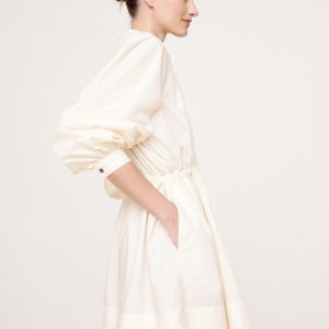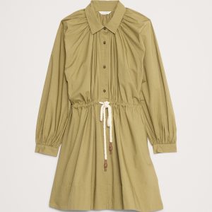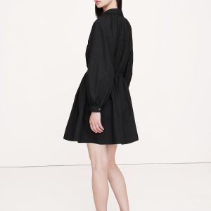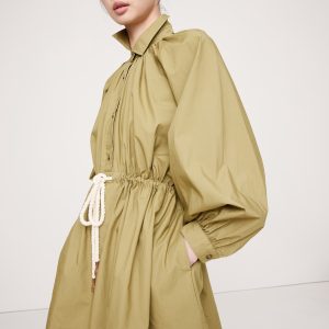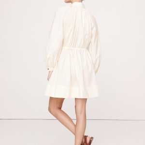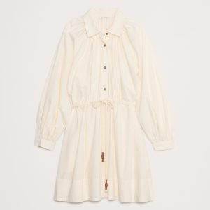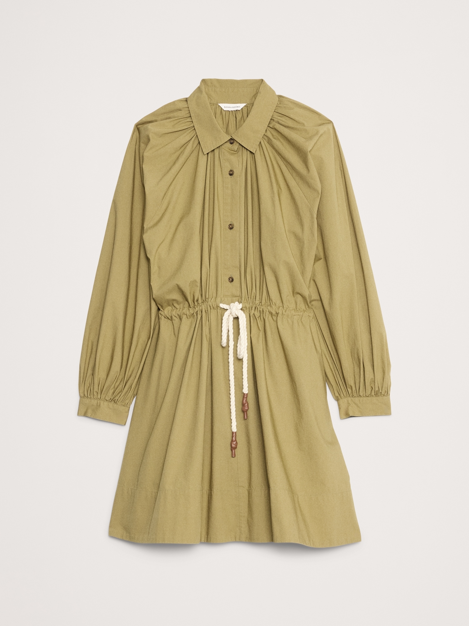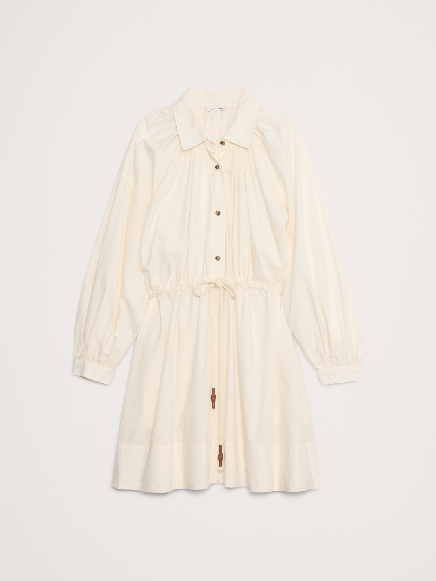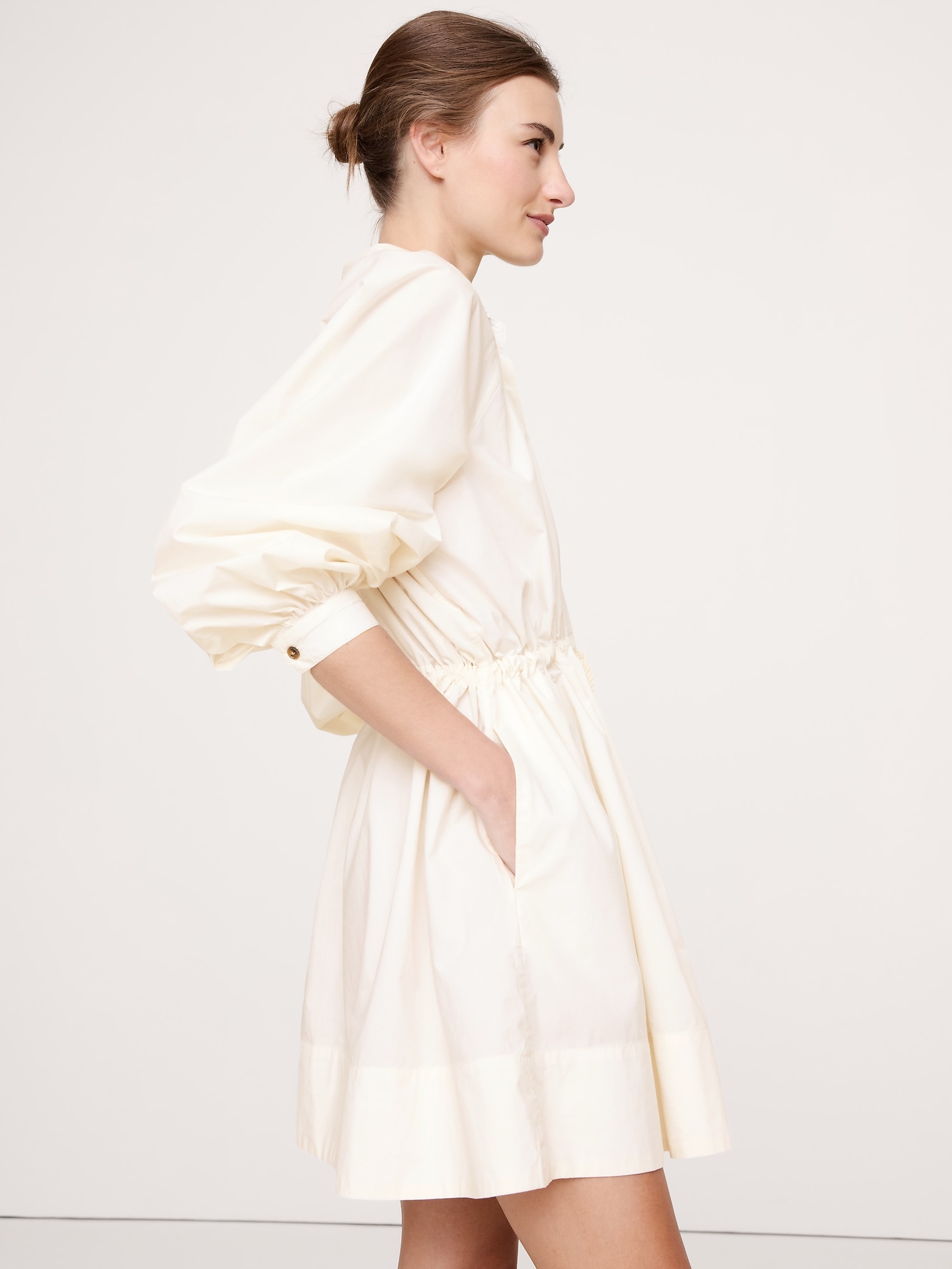 We’re loving cotton poplin right now (and always). This mini dress nods at the season’s volume-sleeve trend, fitted with shirtdress styling and a utilitarian drawstring at the waist.