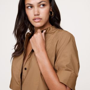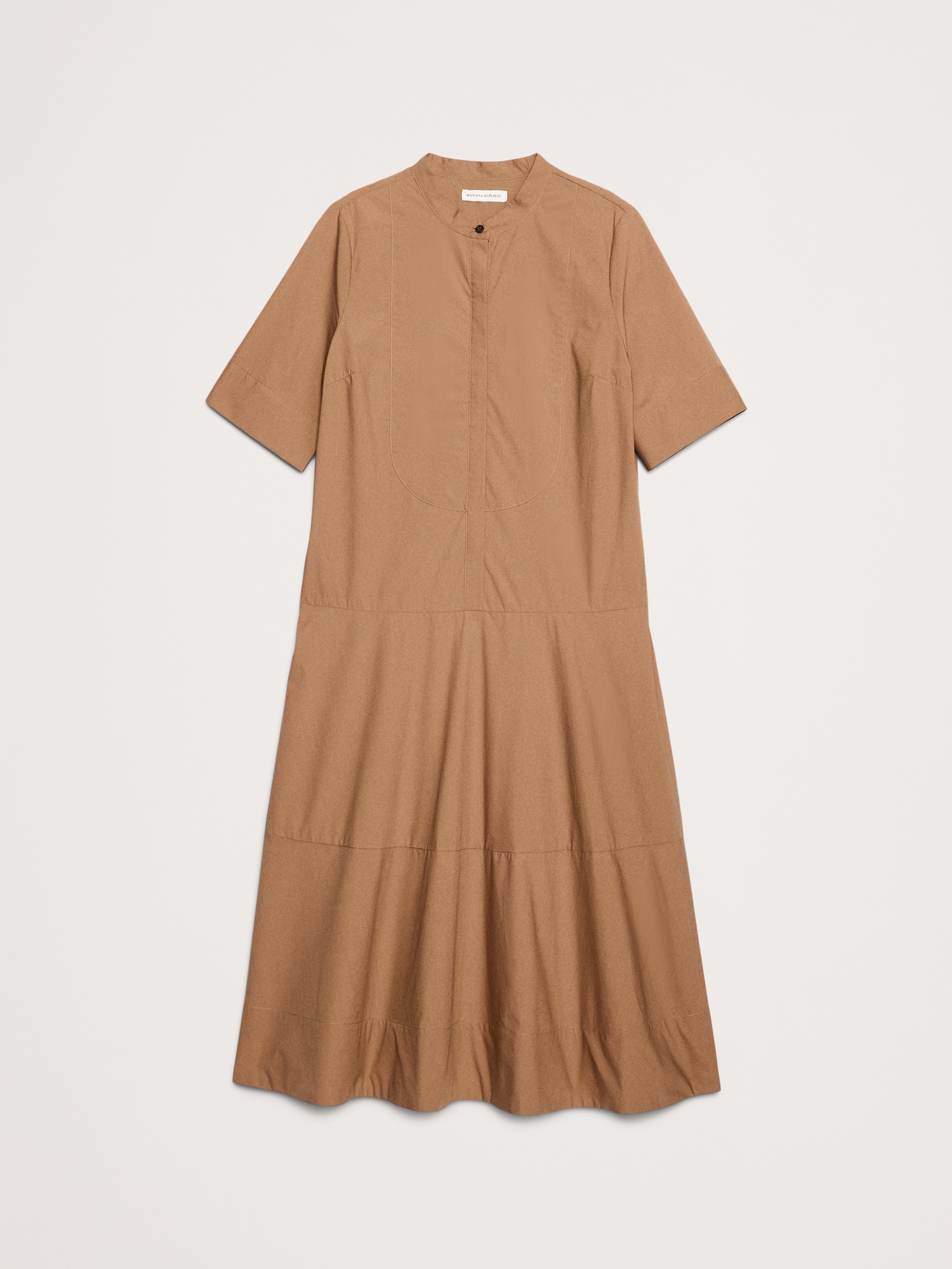 Bring on the sunshine. This is a relaxed shirt dress with a tuxedo-style front panel detail at the bodice, a tiered skirt, and an extra wide hem to add a little flounce.