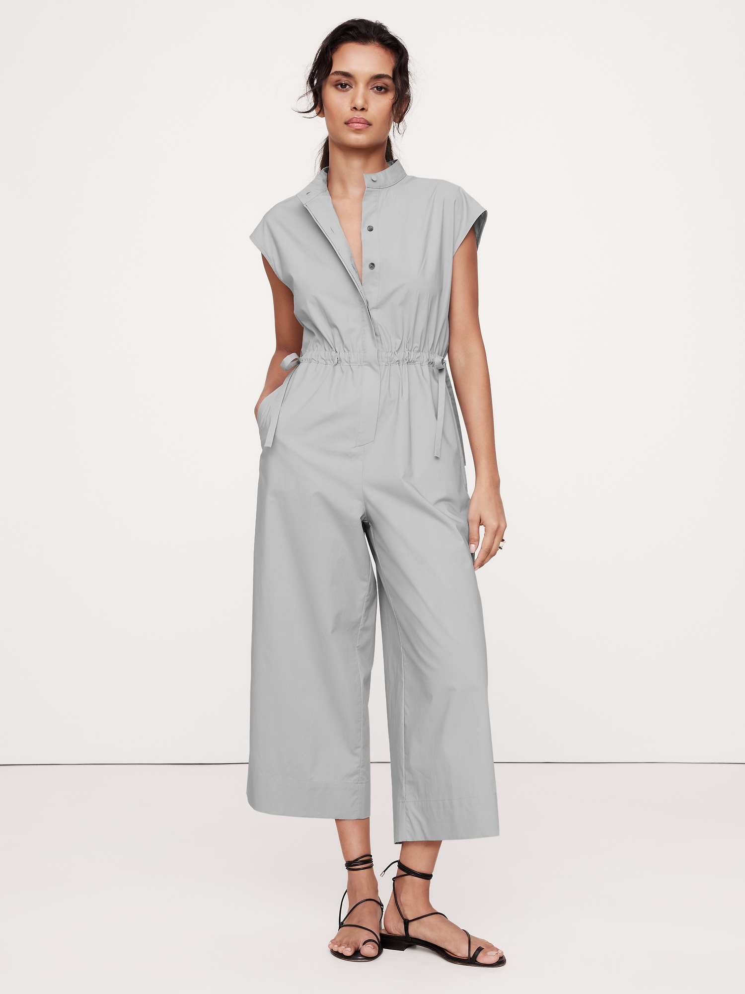 A reimagined boilersuit in 100% cotton poplin. We kept the utilitarian feel with a banded collar and concealed button front, but added a drawstring detail to define the waist.