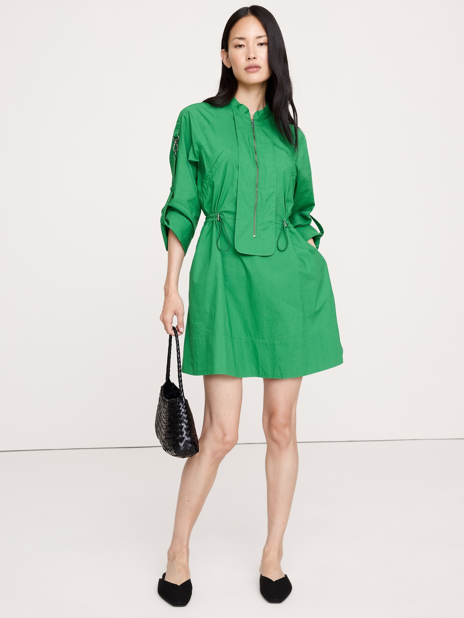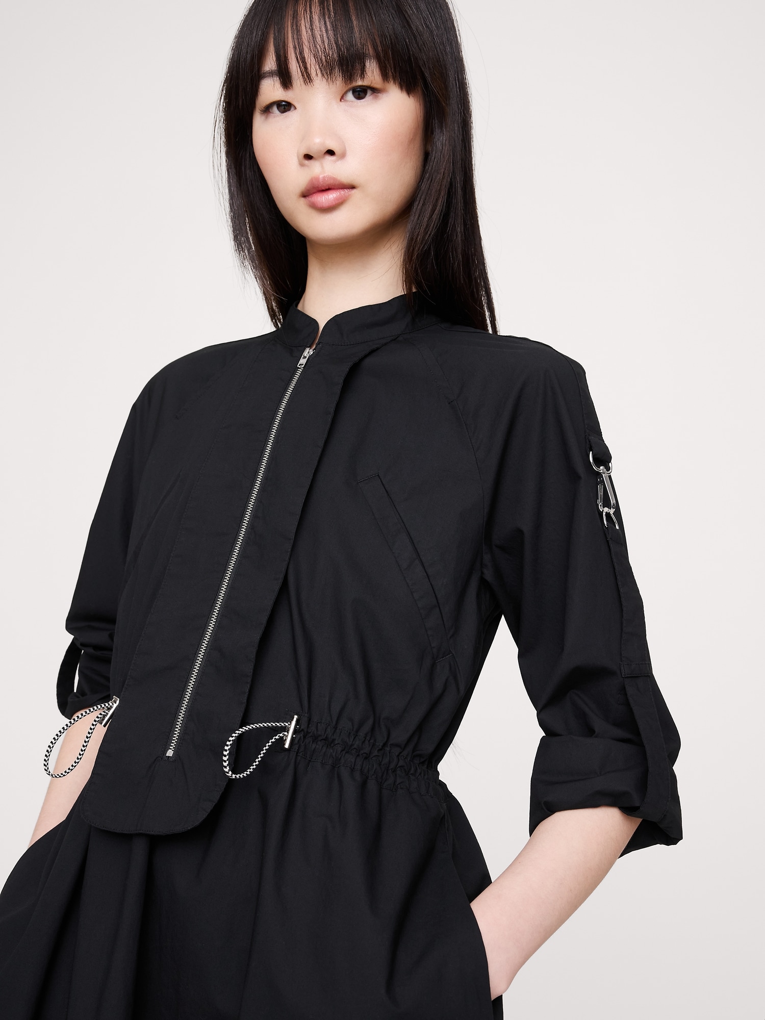 Out the door in no time. This mini dress borrows its utility detailing from classic boilersuits. Plus, we added a bungee detail to cinch the waist—in our stretch-cotton ripstop fabric, with its signature grid texture. Fit Flare: Relaxed through shoulder, sleeves, and bust, fitted waist with a flare skirt. Zip front closure. Banded collar. Front pockets with zip closure. Unlined. #818082
