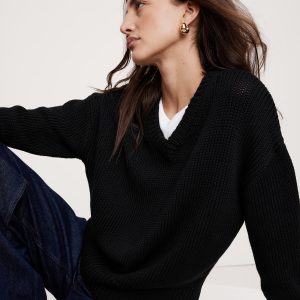 We modeled this classic v-neck sweater after a vintage one we found in our archives. We knitted it in our chunky cotton yarn, borrowing the high v-neckline from the original and opting for an oversized silhouette to make it modern.