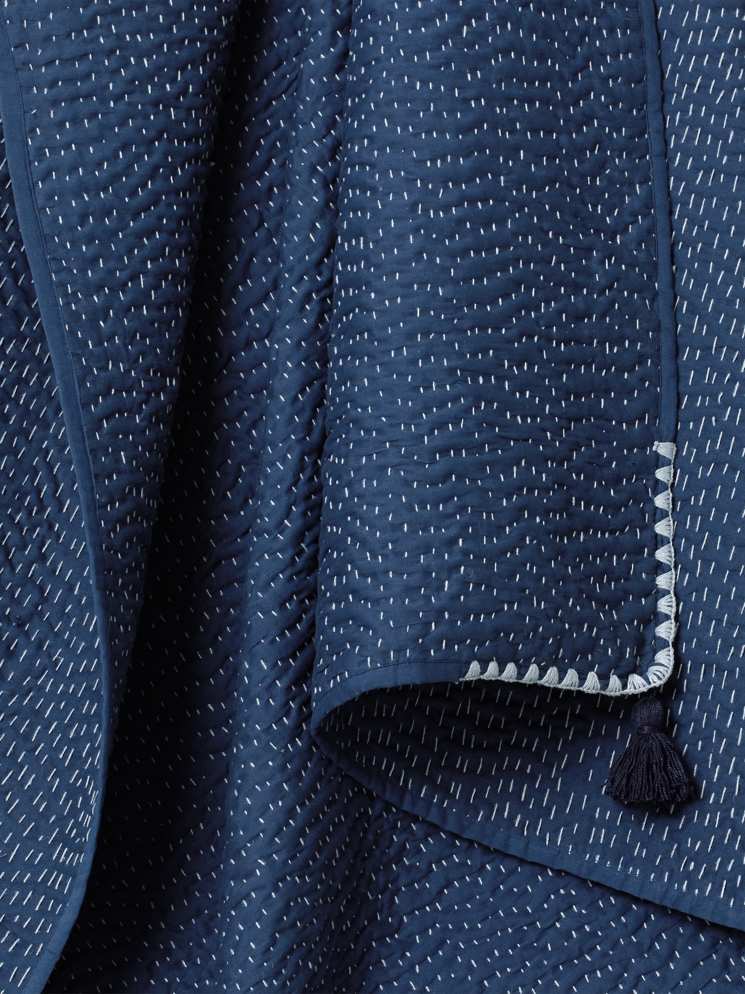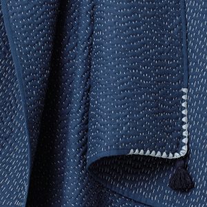 Indigo-dyed cotton creates a relaxed, richly textural design. Soft, lightweight, and fully reversible, this throw is meticulously hand-stitched in the Kantha style using centuries-old techniques to attach layers of indigo-dyed soft cotton toile. Complete with intricate edgings and handmade tassels, this deep blue throw brings a statement-making impact to any room. Tassel detail. Made in India. #805596