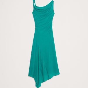 An architectural take on the 90s slip-dress, cut from a viscose crepe that feels light-as-chiffon with a subtle stretch. A twisted shoulder detail, ruching at the side, and bias-cut panels enhance its fit-and-flare silhouette.