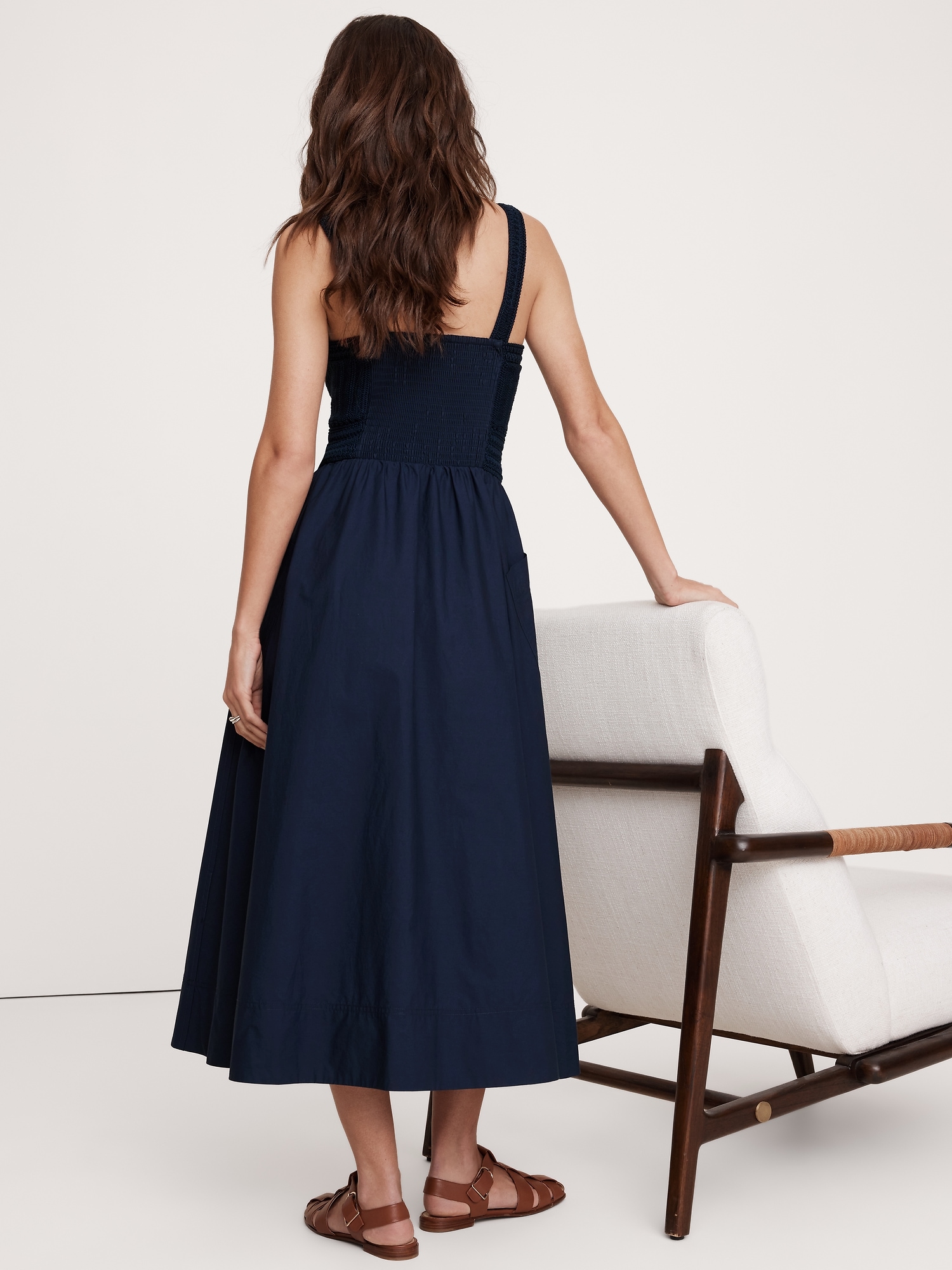 Our take on the season’s mixed-media dresses, in a midi length. Crafted in a mix of a crochet-like knit bodice and a 100% cotton poplin skirt. Did we mention it also has pockets?