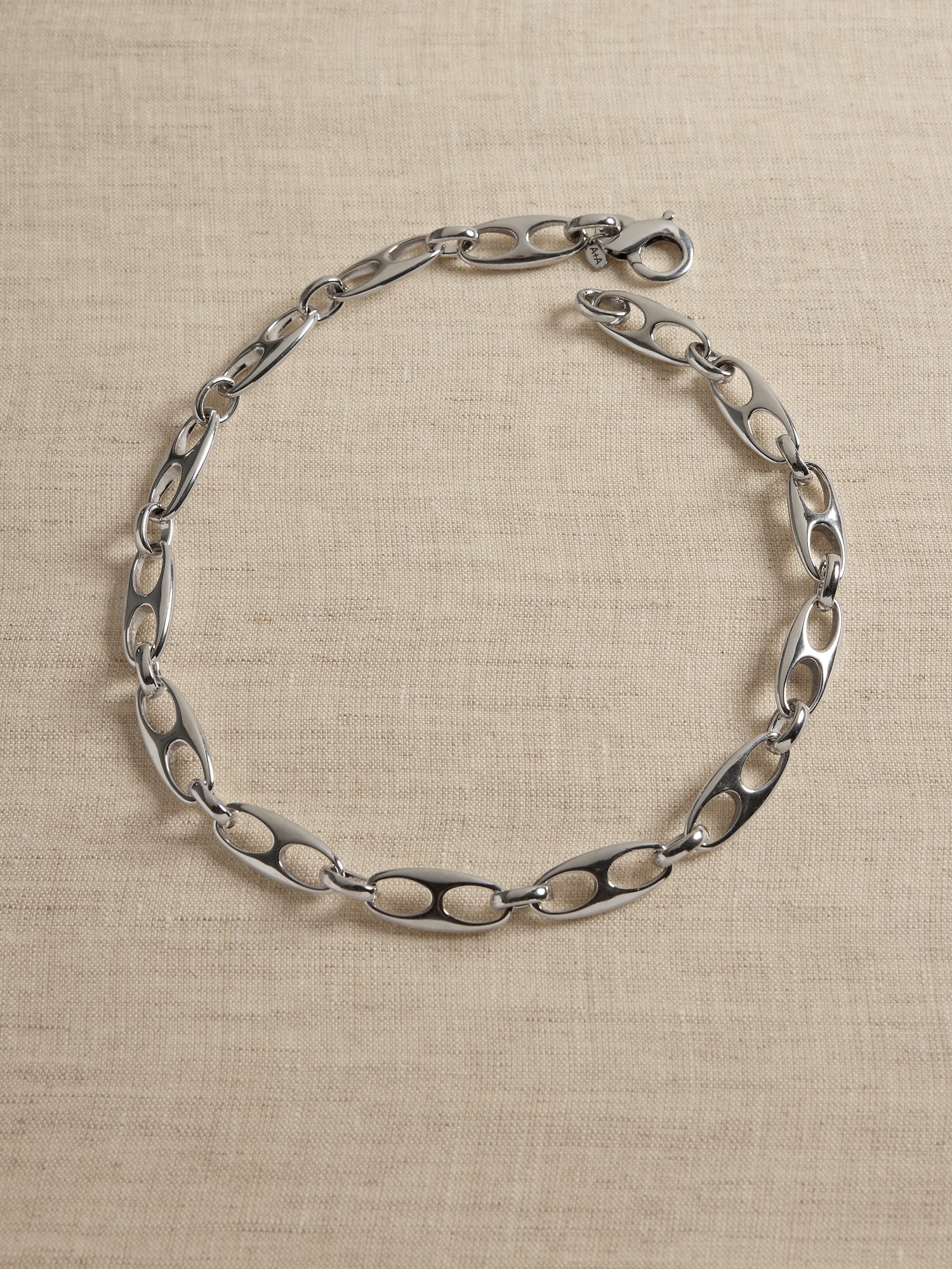 Inspired by the age-old design of nautical anchor chain and updated with a contemporary lure, elongated cast mariner links are hand-joined to create this eye-catching necklace.