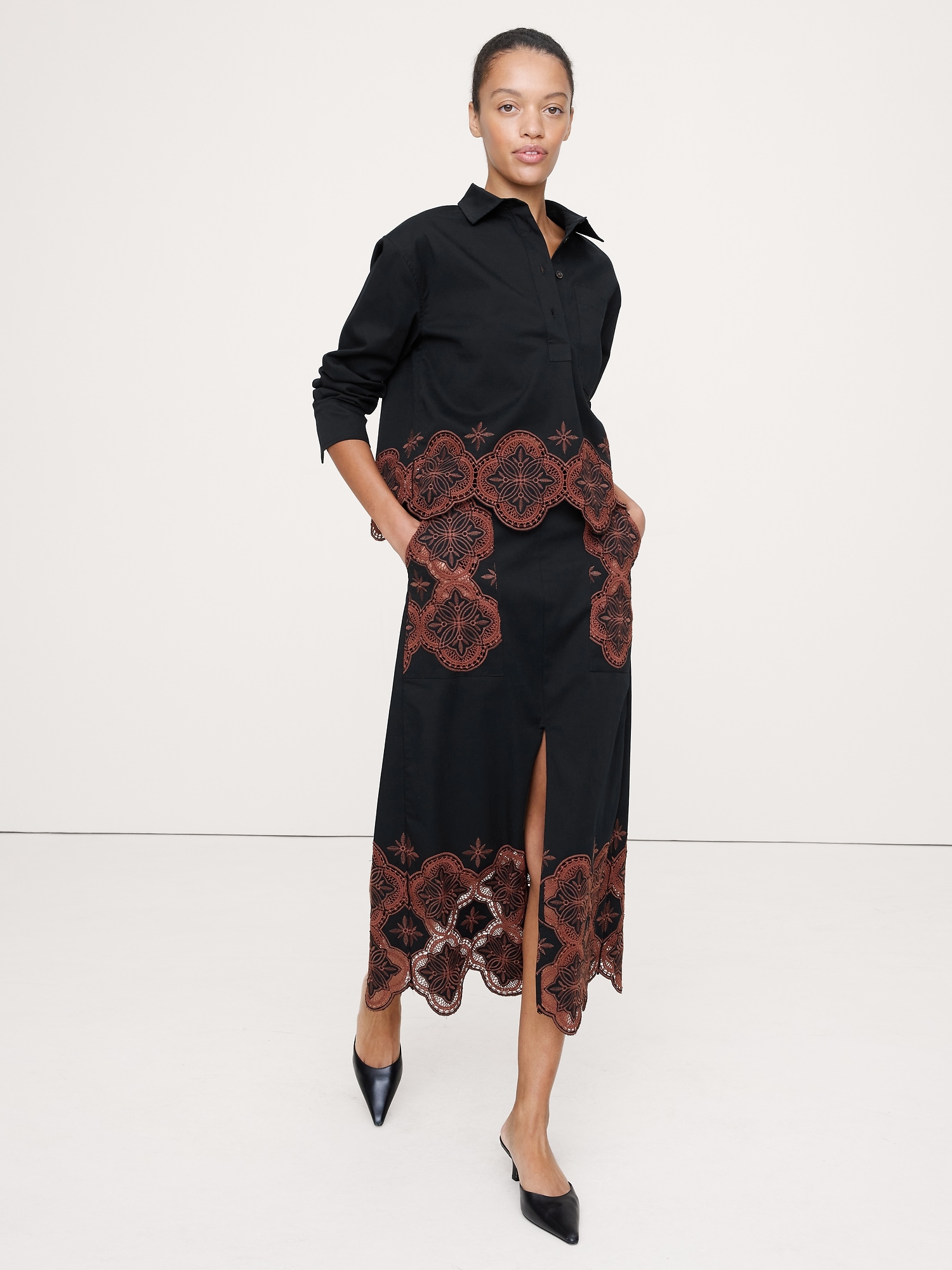 An ode to traditional anglaisethis midi has embroidered cutwork lace accents at the hem. Cut in our cold-weather ready corduroy.
