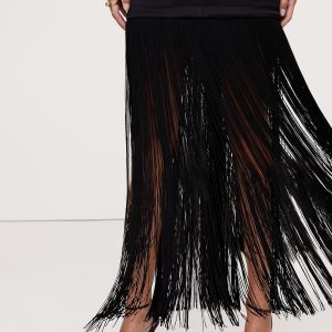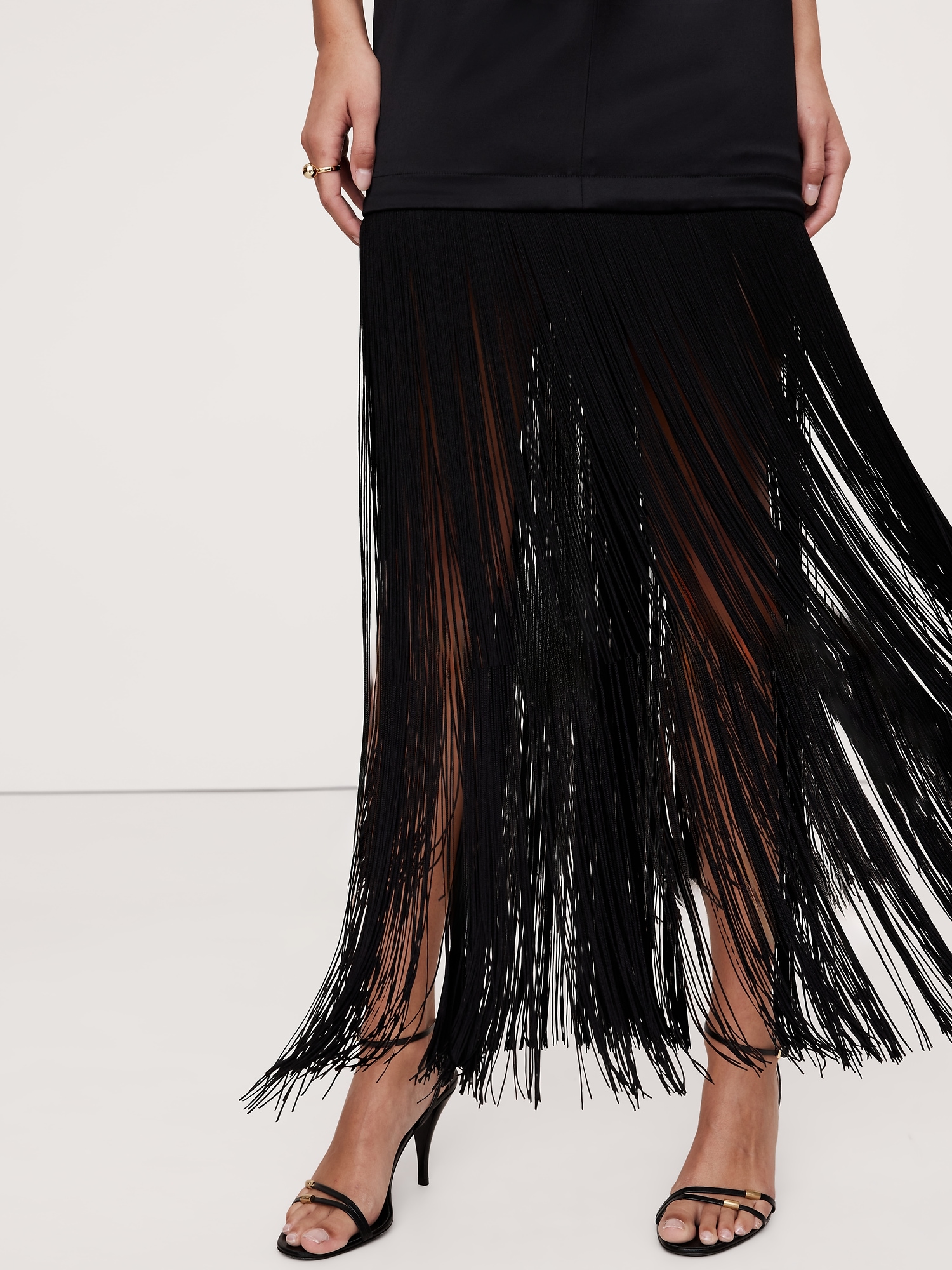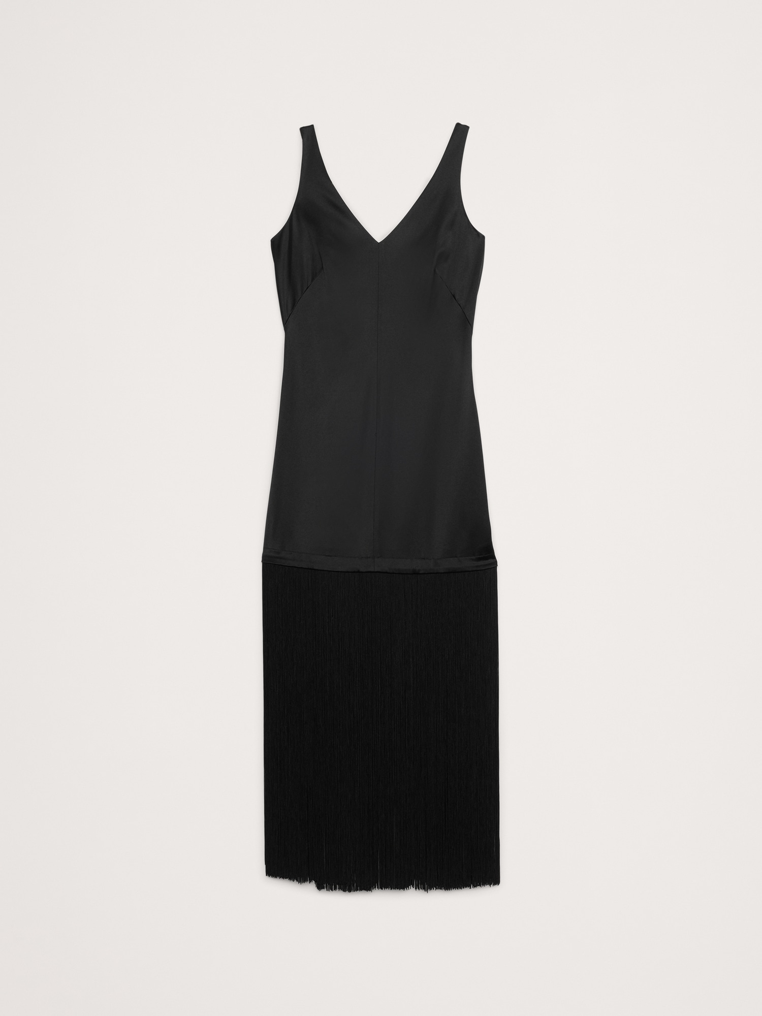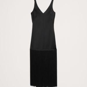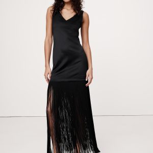 A LBD that’s ready to party, this satin maxi dress molds to your shape with special darts at the back and bust, finished with long fringe that moves with every step.