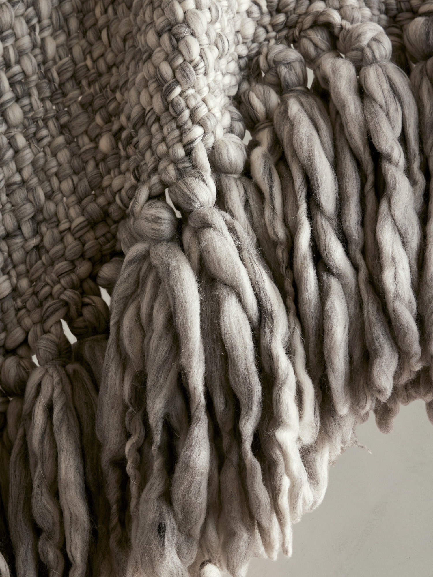 Look closely, this delightfully soft and warm throw blanket is crafted from a mix of undyed Merino wool. The fibers are carded, spun, and woven by hand to create spectacular and irregular dimension with long fringed ends, ensuring no two pieces are exactly alike. Why hand-carded? Increasingly uncommon, hand-carding wool—a specialized process akin to combing out fibers before they’re spun into yarn—produces a luxuriously irregular effect that reveals the natural beauty of this Merino wool as well as the expert hand of its maker, something which we celebrate. Handmade in India. #618914