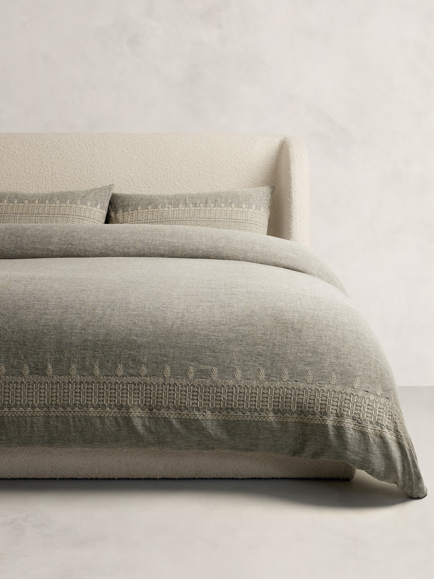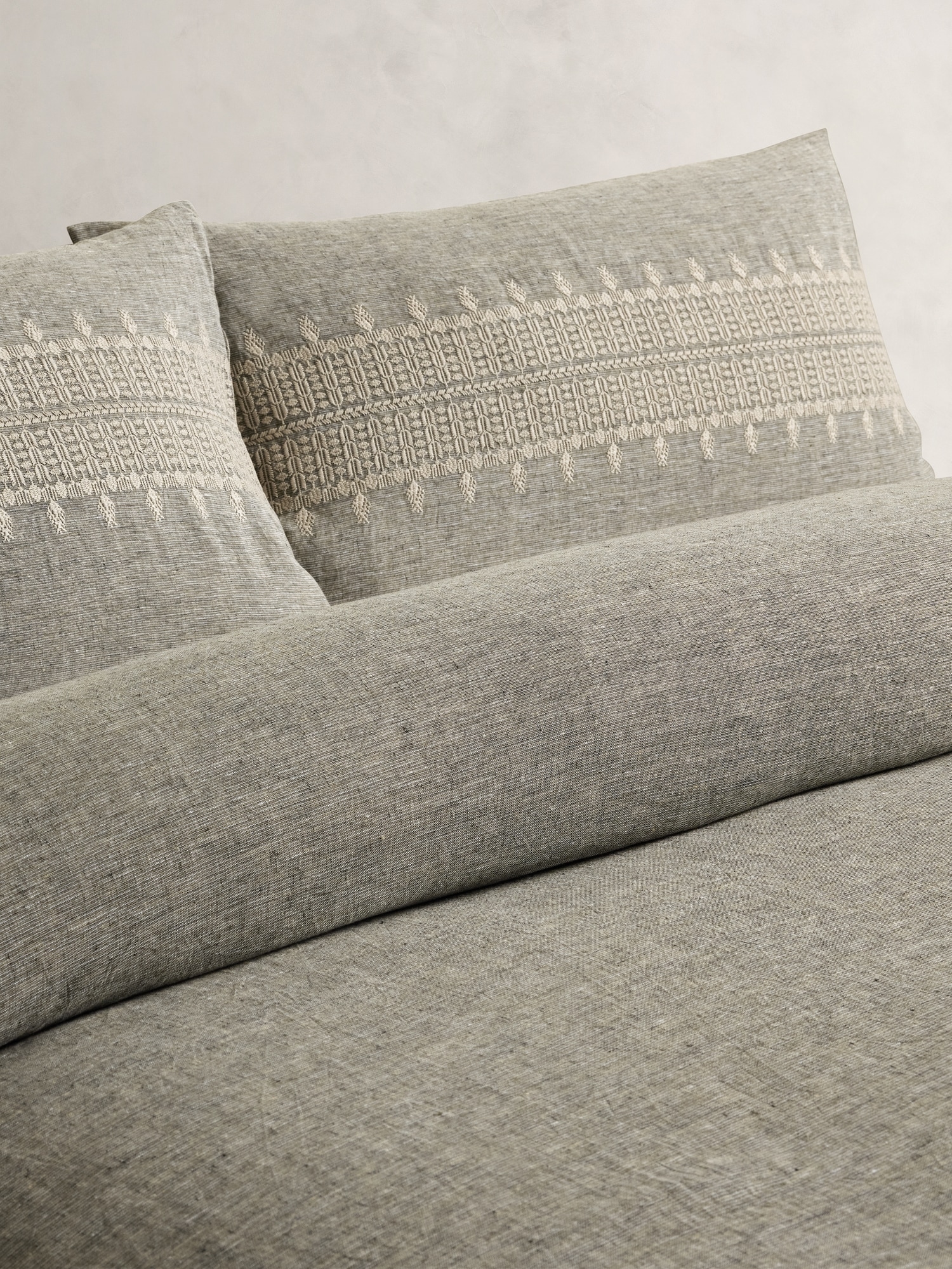 Our homage to the rich embroidery traditions of Morocco, this bedding collection is framed with intricate cross-stitched patterns that accent the border of this linen and cotton duvet cover.
