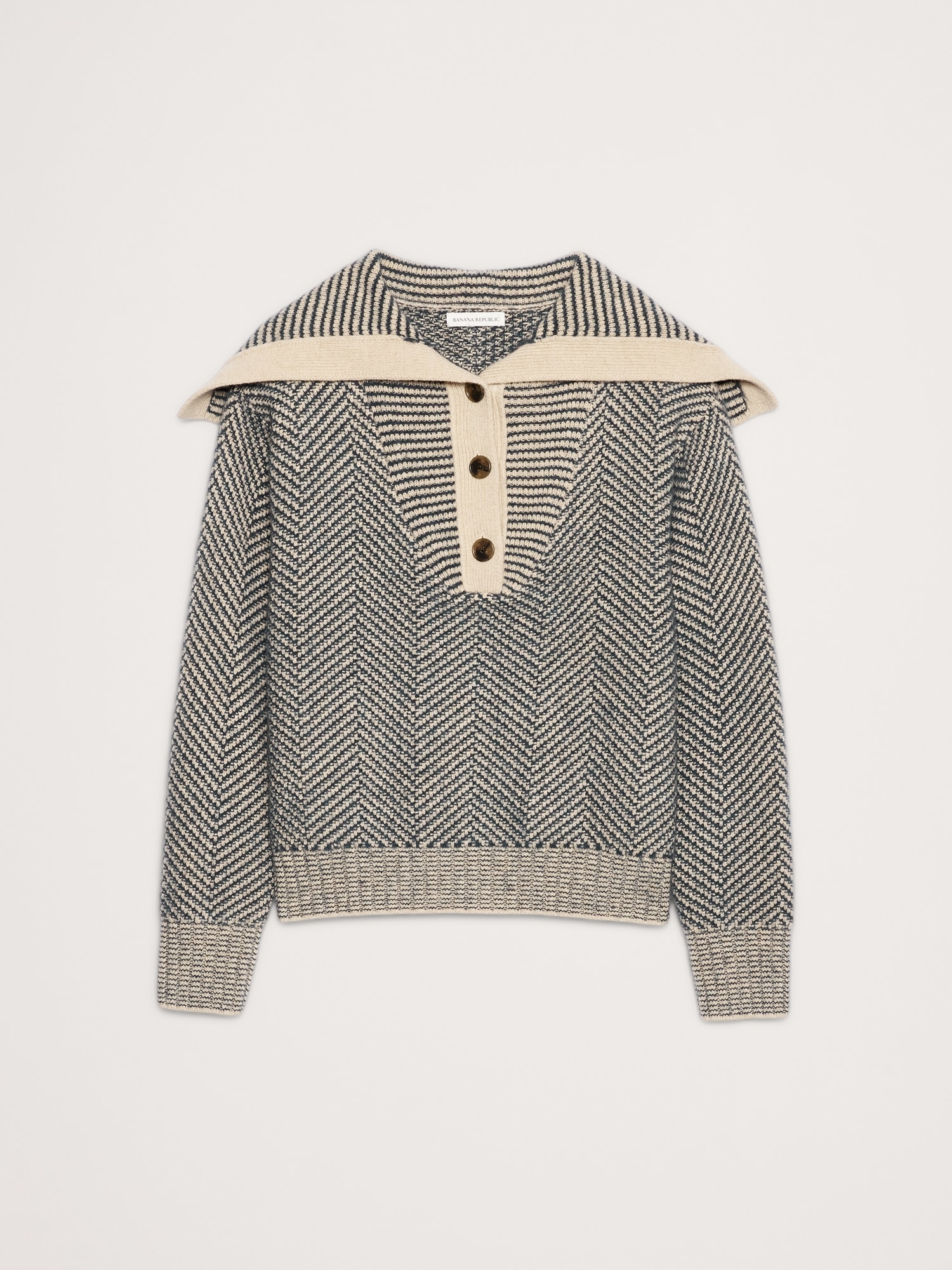 Everything about this sweater is the oversized fit, a dramatic sailor collar, and the intricate herringbone jacquard pattern. It’s knit from yarns spun from some of our cold-weather favorites: Merino wool, cotton, and luxe alpaca.