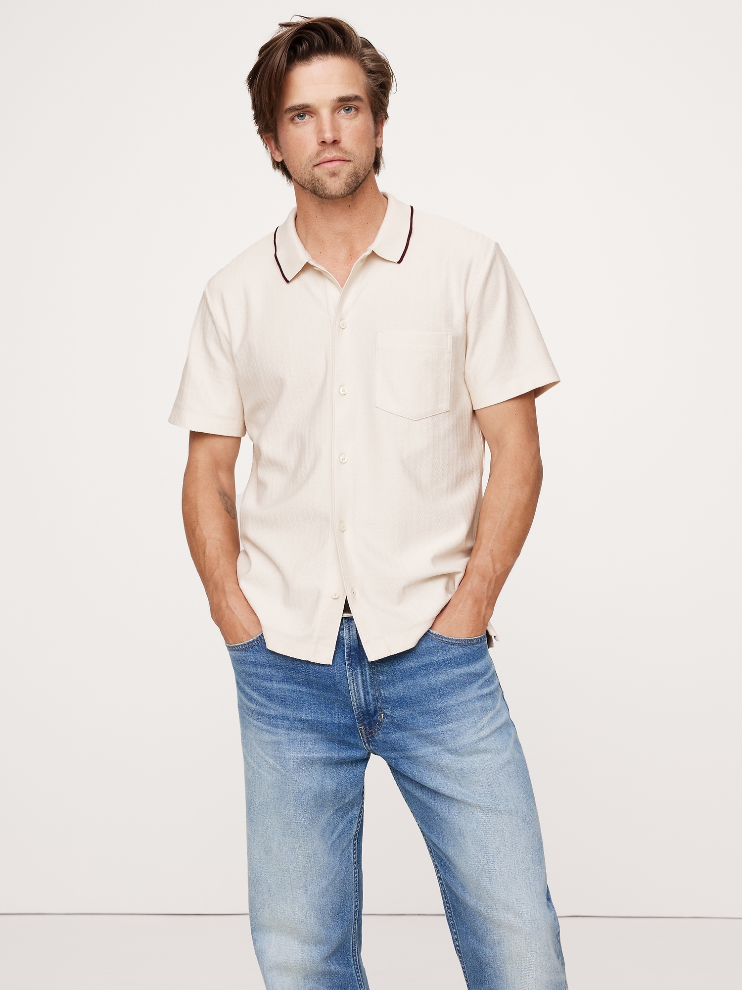 We love the herringbone texture of this soft, resort shirt. Plus, we added a contrast color accent at the collar for a vintage vibe.