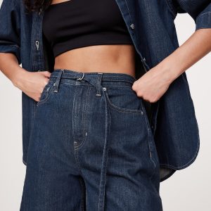 High rise (12\”). Fitted waist, relaxed through the hip and thigh with a wide leg.
