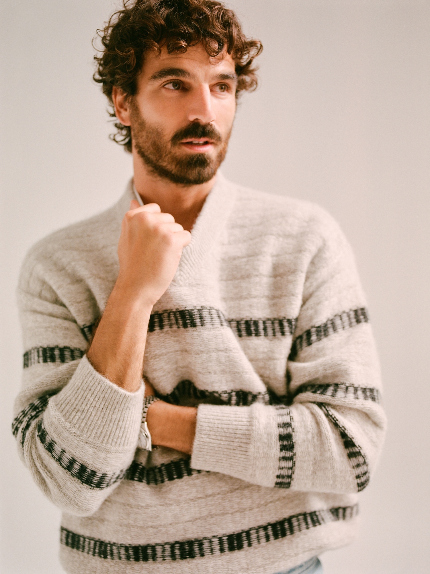 A v-neck sweater with a vintage vibe. Look closely: this one achieves its subtle, tonal stripe by mixing both colors and stitch types, in a soft and warm blend of alpaca, wool, and nylon.