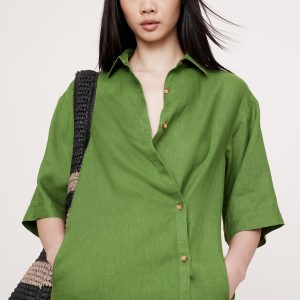 A best-selling style now in 100% certified-European linen, this dress features two sets of buttons: one to wear as an oversized button-front shirt dress and a second set to style as an asymmetrical wrap dress.