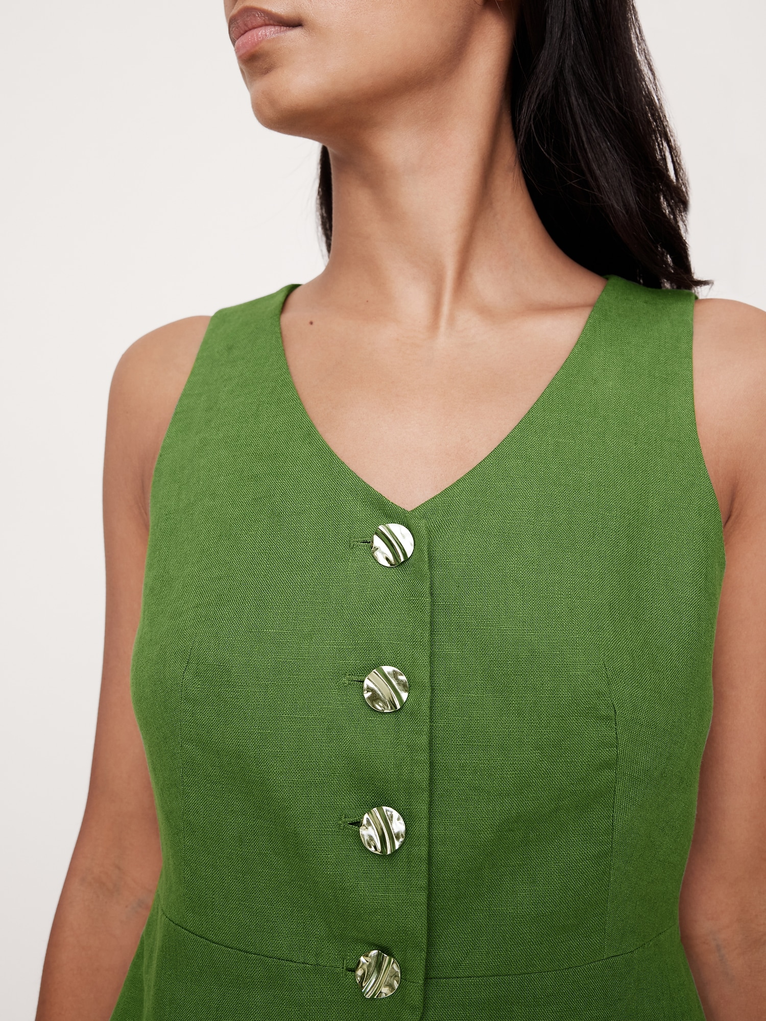 We designed this tailored vest with darts at front and back to define the waist, crafted in 100% certified-European linen with novelty buttons.