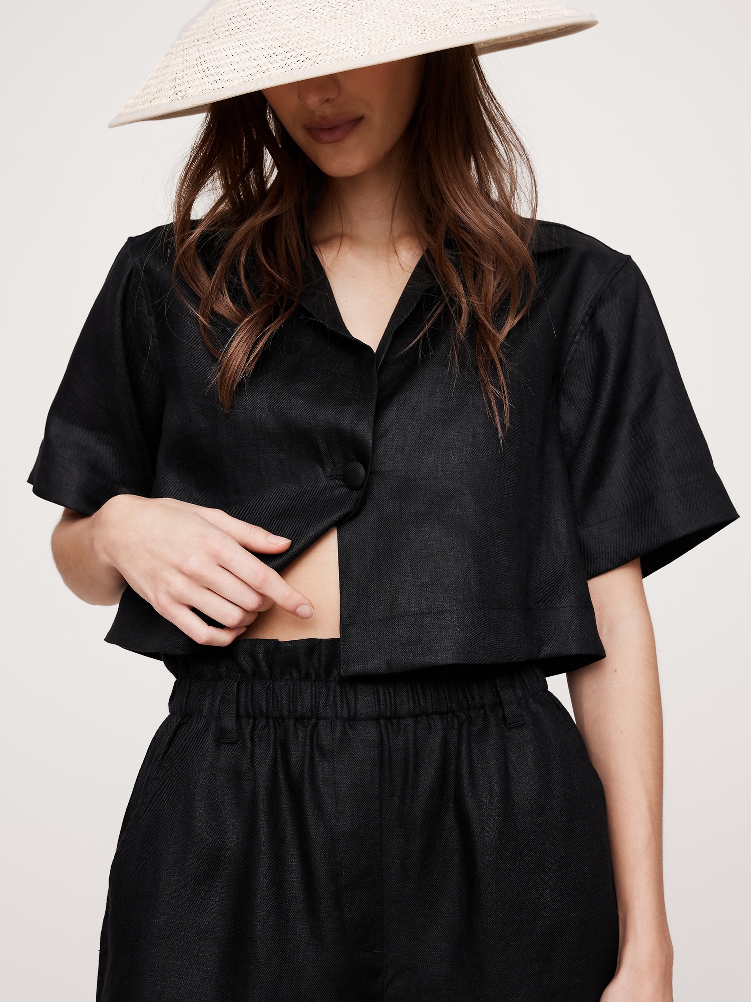 We love an easy linen short. We designed these with a high rise and paperbag waist so they work with on-trend cropped tops. Make it a set with a matching linen one.