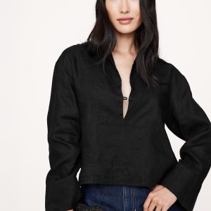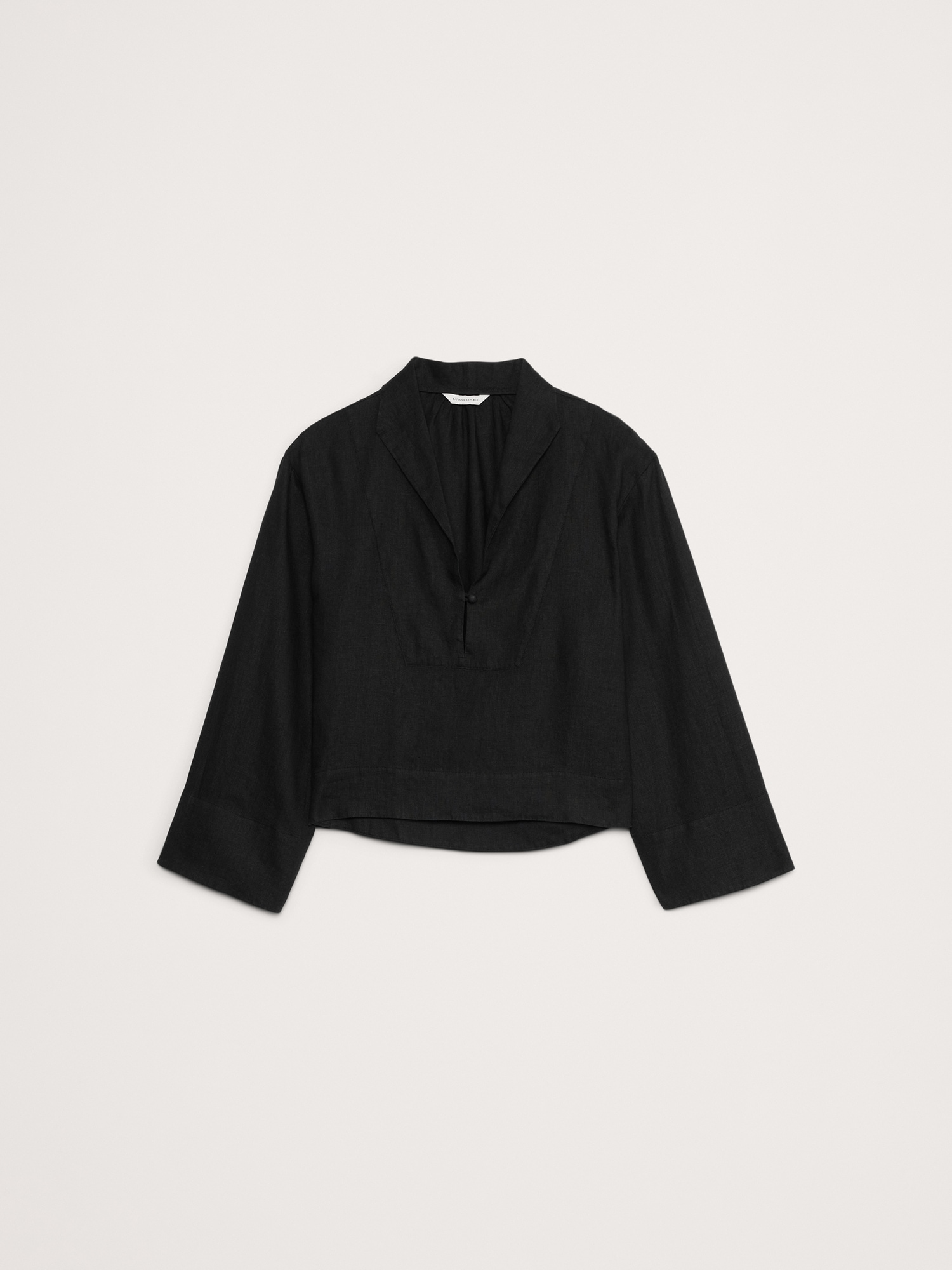 An easy popover top, in 100% certified-European linen. We added wide sleeves and a split neck with a single button.