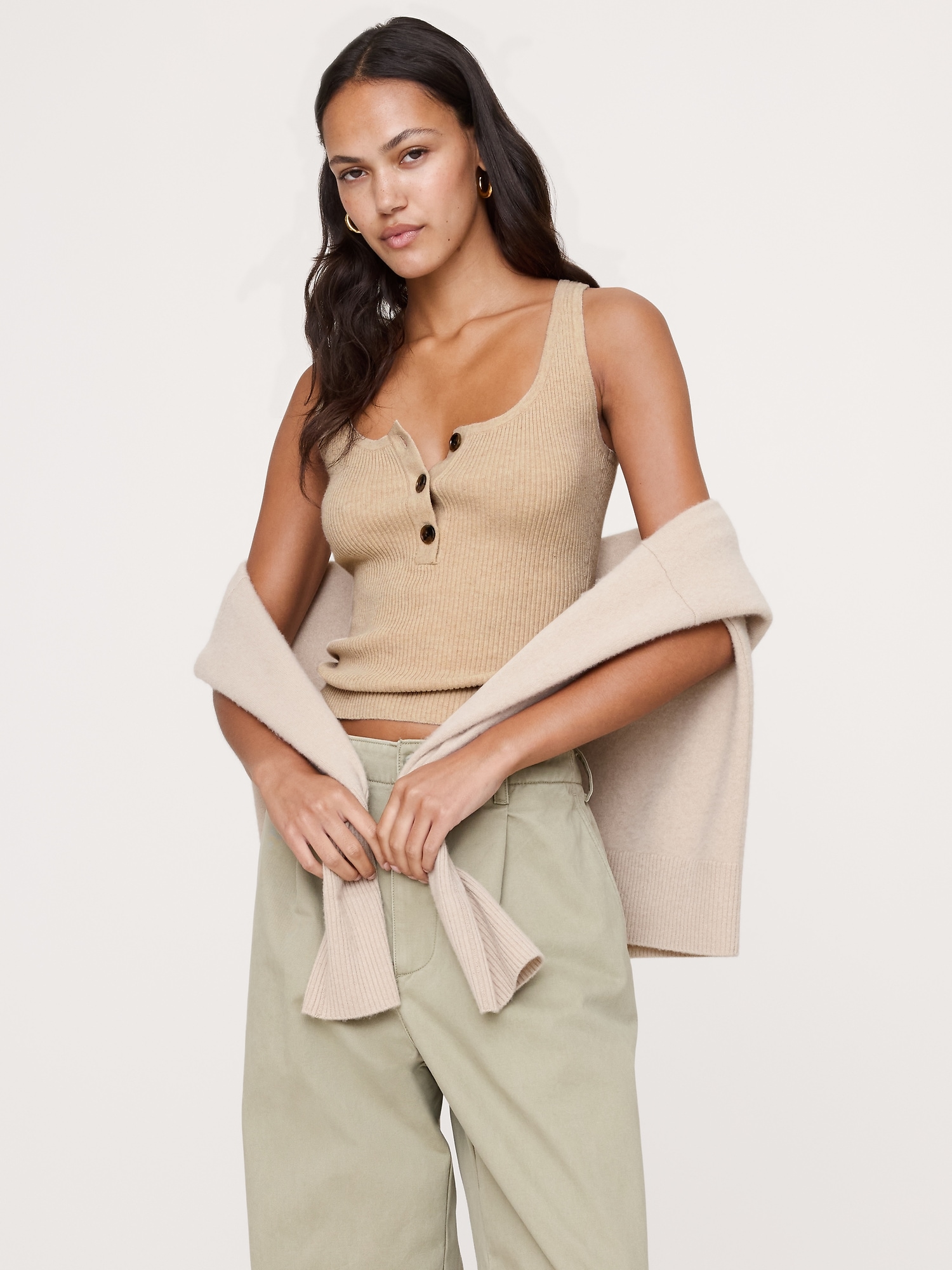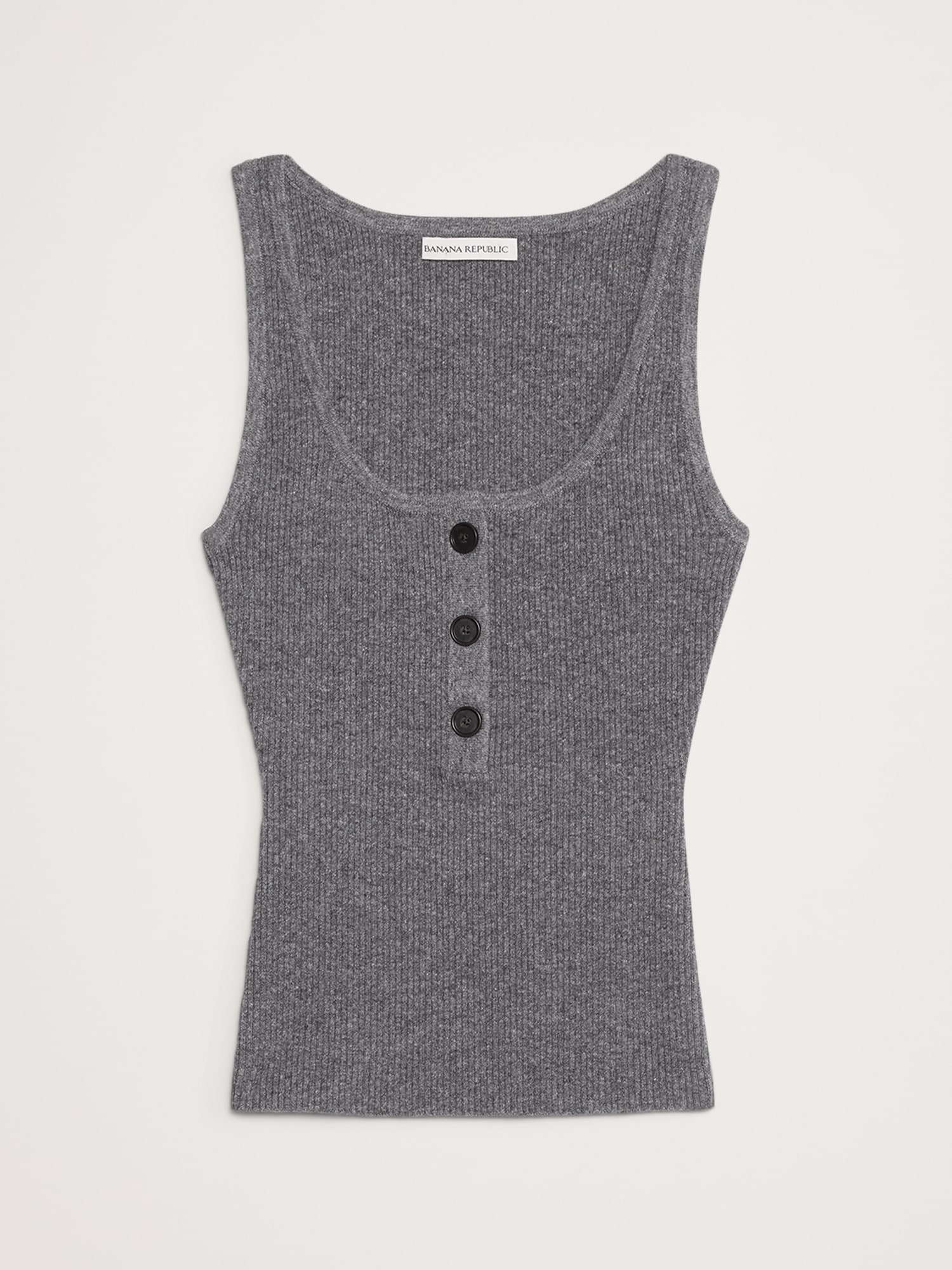 A cute ribbed tank with henley details, knitted in a soft blended yarn of all-weather Merino wool and cotton.