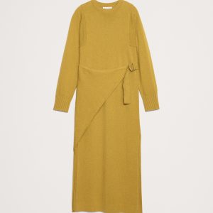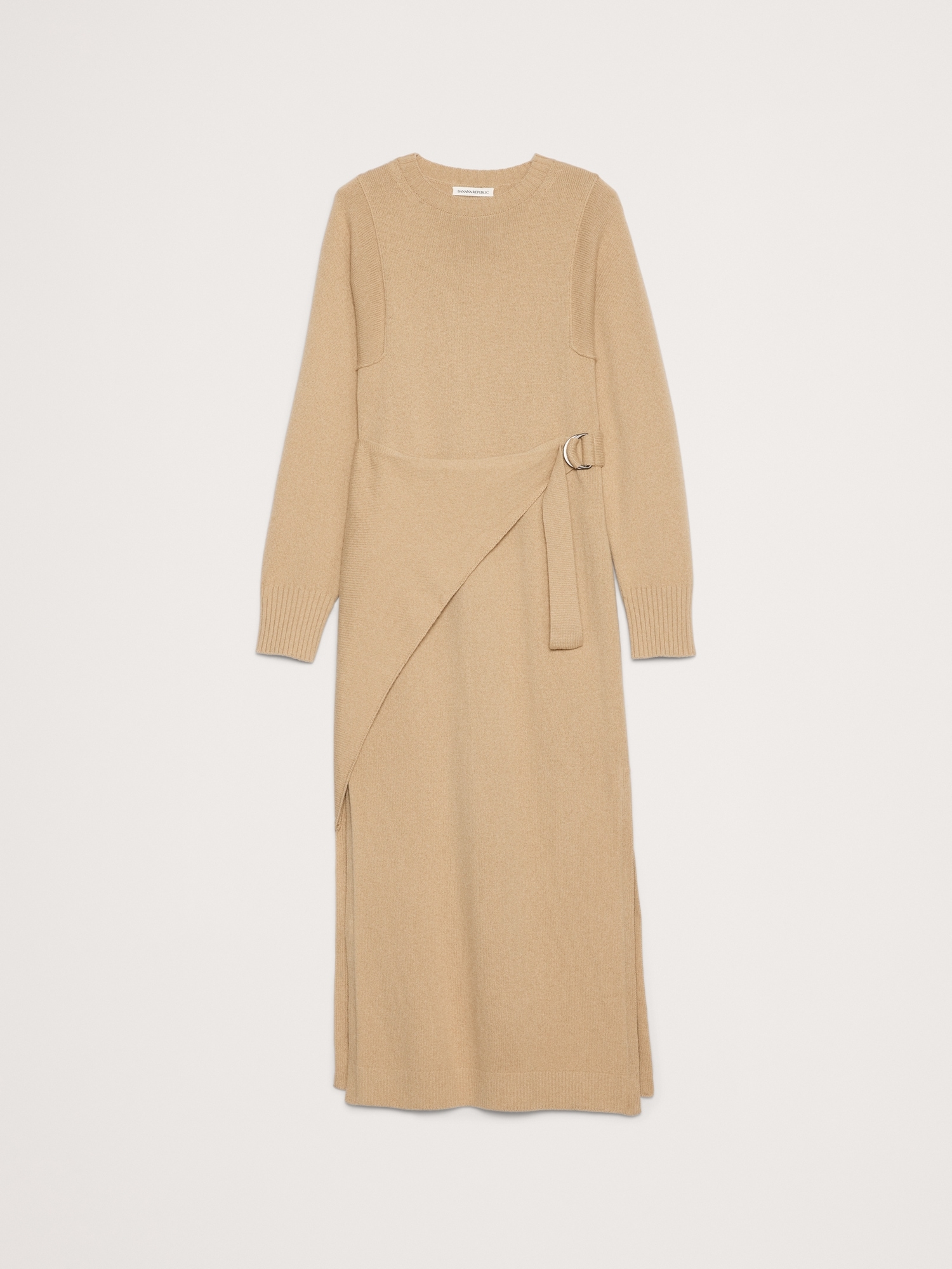 We’re dreaming of a warm sweater dress to carry us through cool weather. Enter, this maxi wrap dress, knitted in soft blend of Merino wool and certified-organic cotton, with a tie waist and side slit.