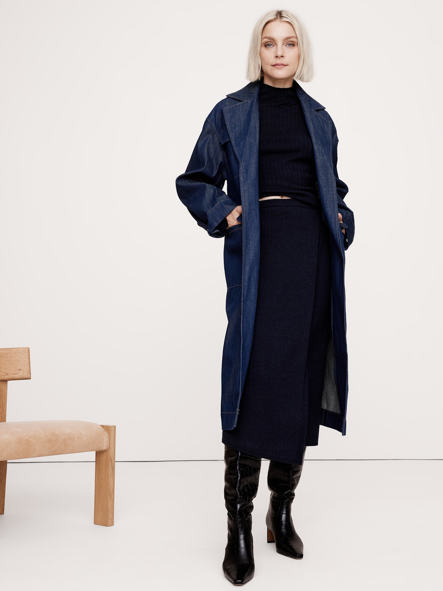This classic wrap-front skirt is knitted from our signature, extra-fine Merino wool using a ribbed-knit stitch to enhance its beautiful drape.