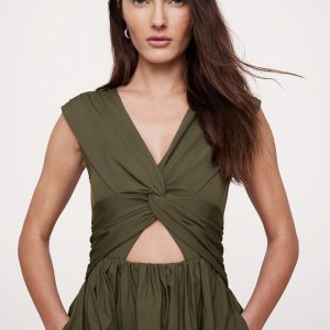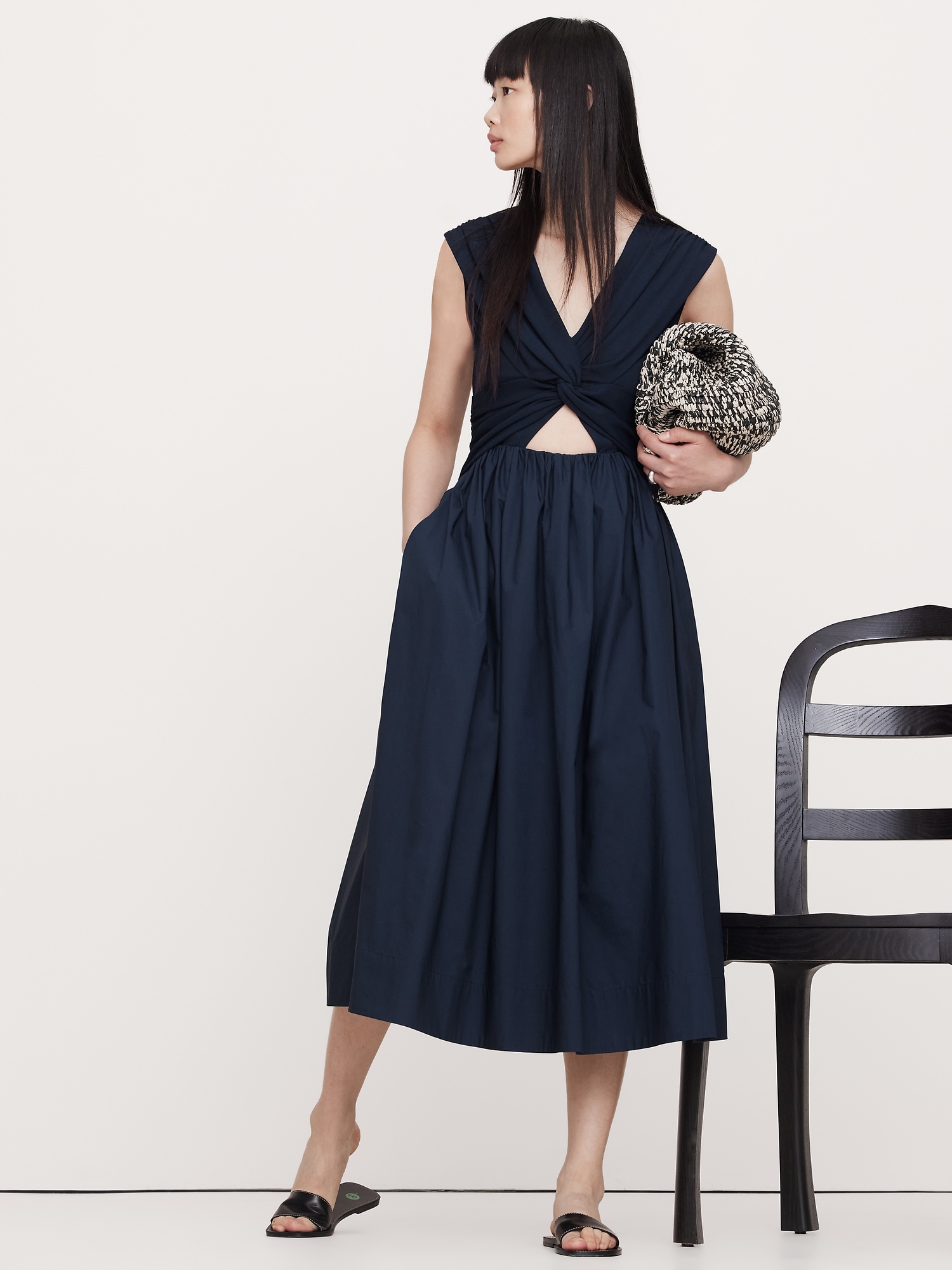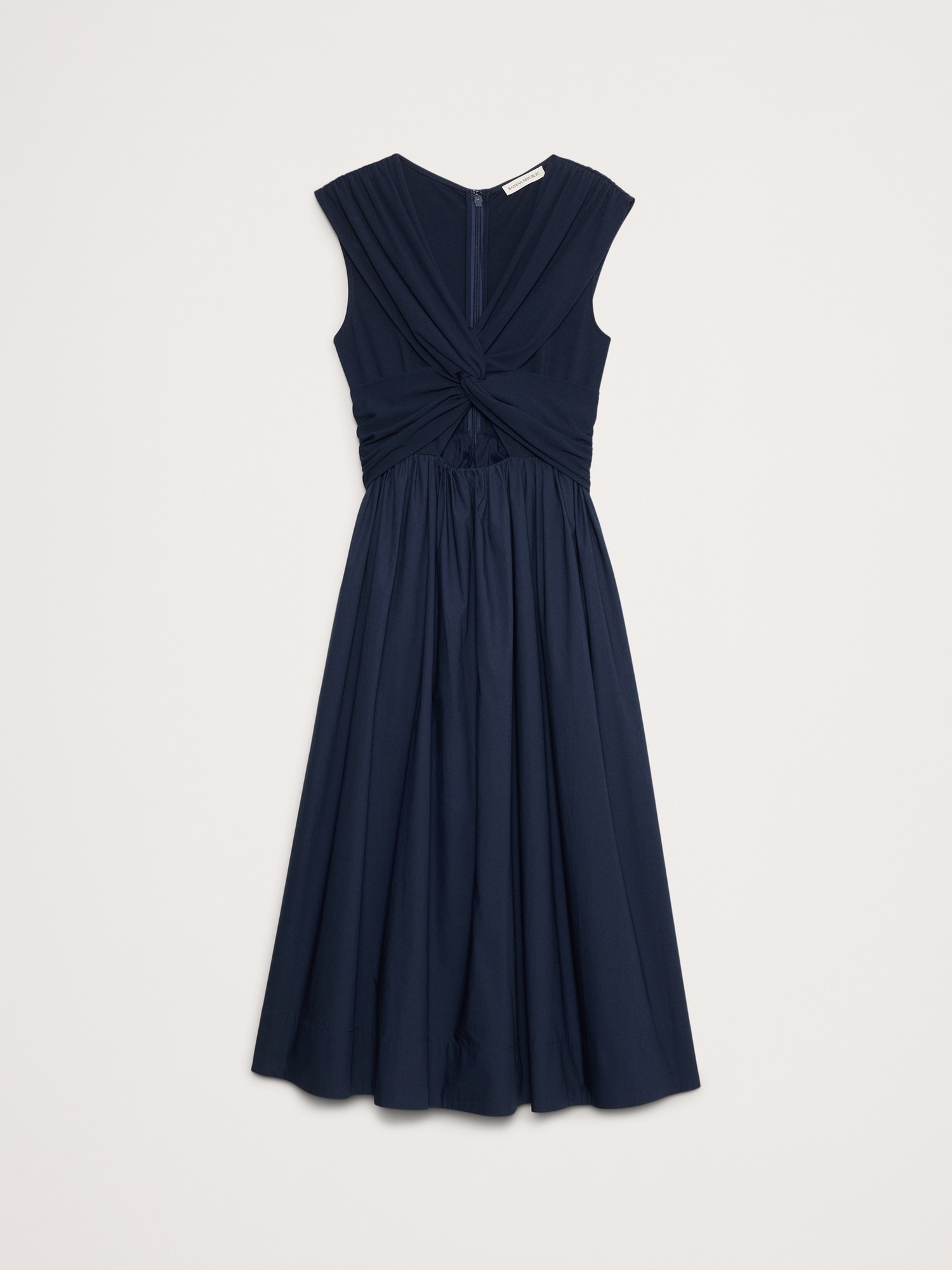 Soft, stretchy jersey twists to create a cutout effect at the waist of this mixed, media dress, finished with a 100% cotton poplin skirt. Did we mention it also has pockets?