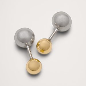 Balanced barbell earrings with contrasting ball accents, in 14-karat gold and 999-silver plated brass. Can we worn with either color facing forward or back.