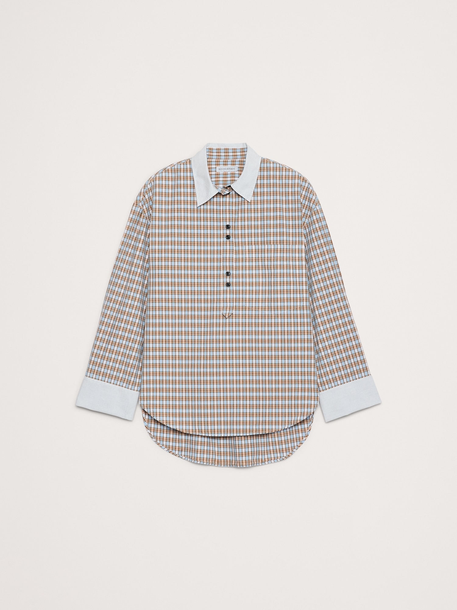 Also known as a \”Banker collar\” shirt, we reimagined this classic silhouette with its distinctive contrast collar and cuffs as an oversized tunic, in our signature 100% cotton poplin.