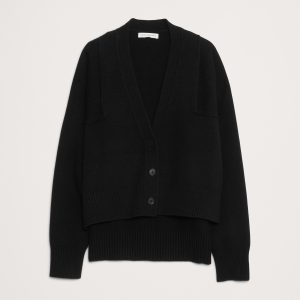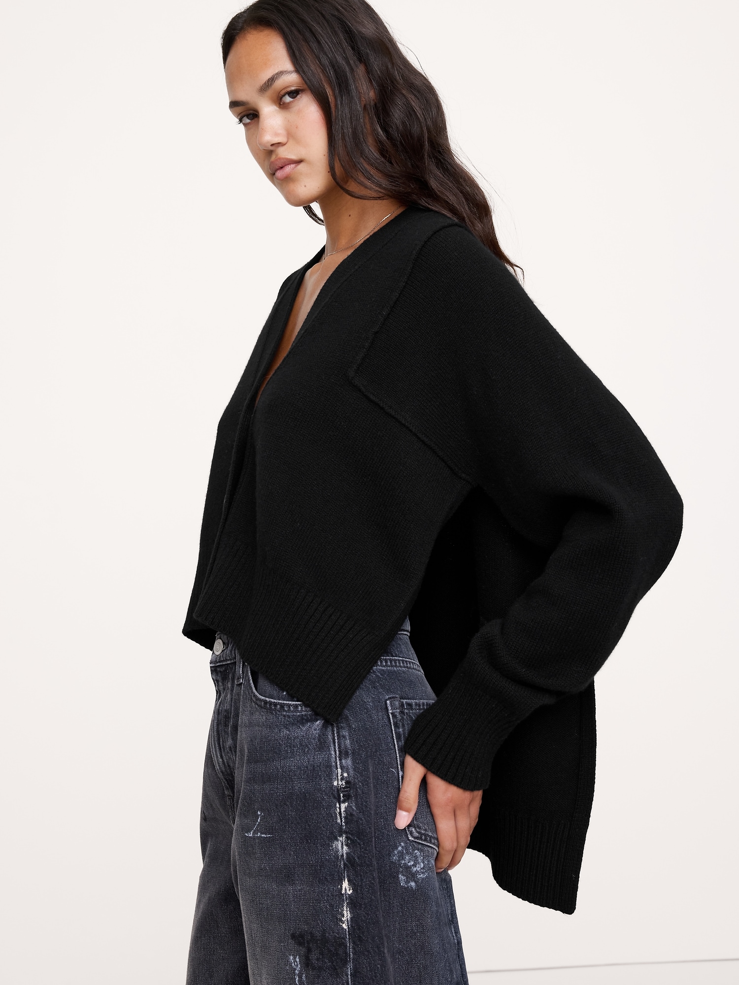 Deconstructed, reconstructed. We crafted this cardigan sweater with exposed seam details, a high-low, hem and slits at the sides. Cut in a soft and warm Merino wool and cotton yarn.