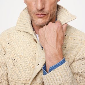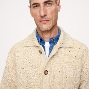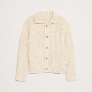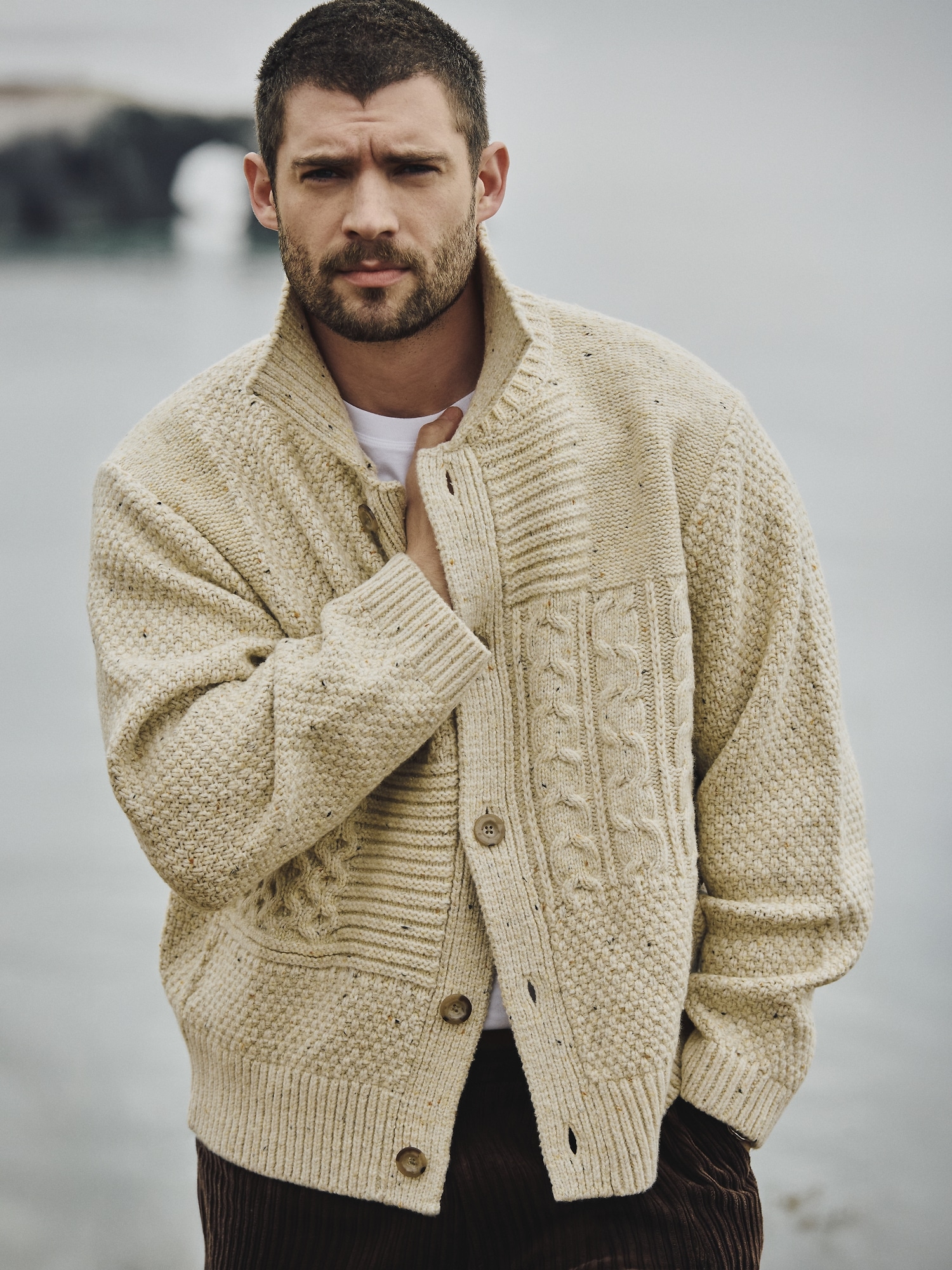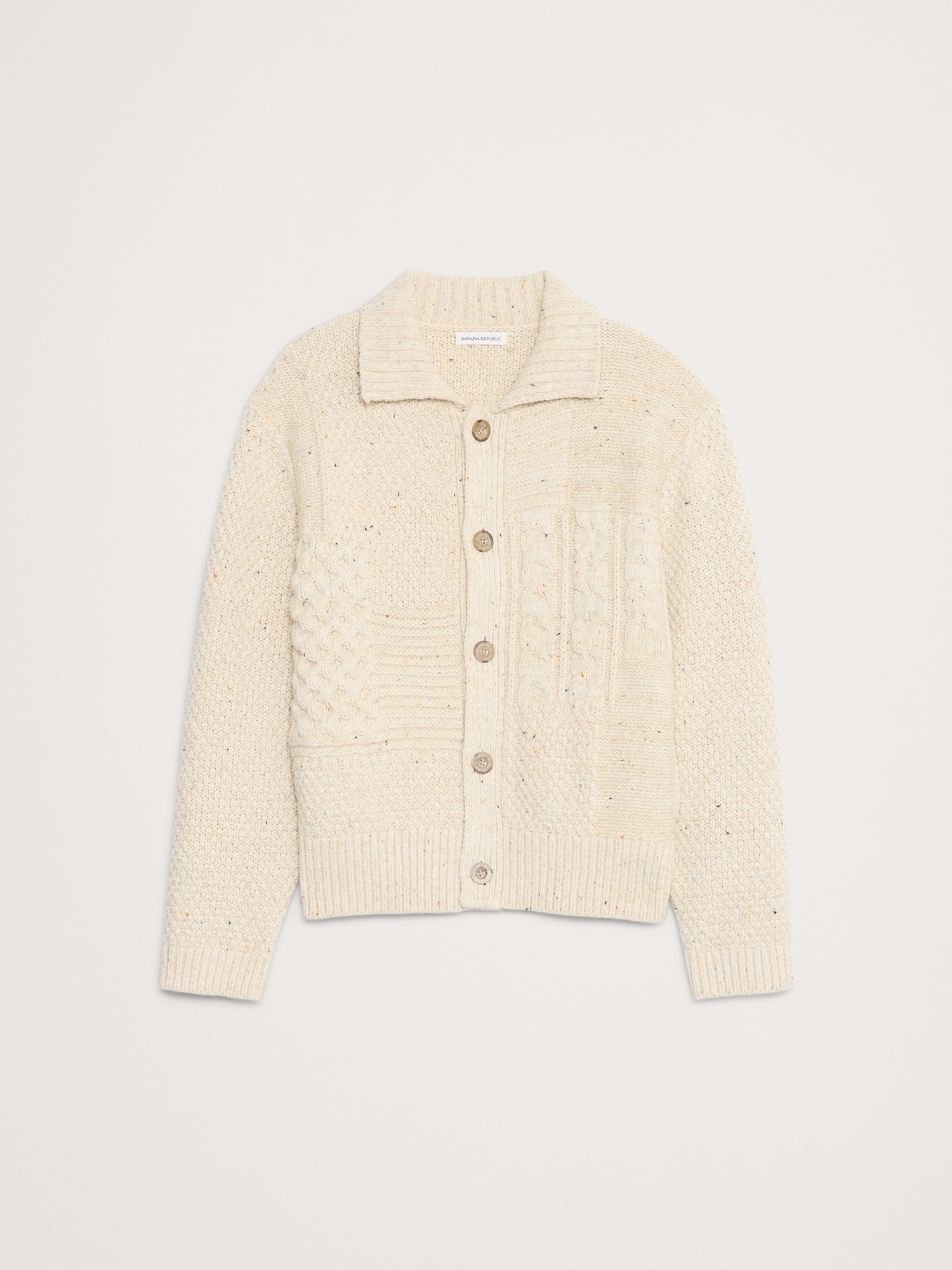 Our take on the patchwork trend, we knit this cardigan sweater with a mix of stitch textures using one of our warmest wool-blend yarns from Italy—one we love for its Donegal-style speckled look.
