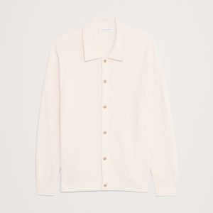 We’re loving sweater polos now (and always), so we designed this cotton one with a full-button front using a special stitch combo to create a plaid texture.