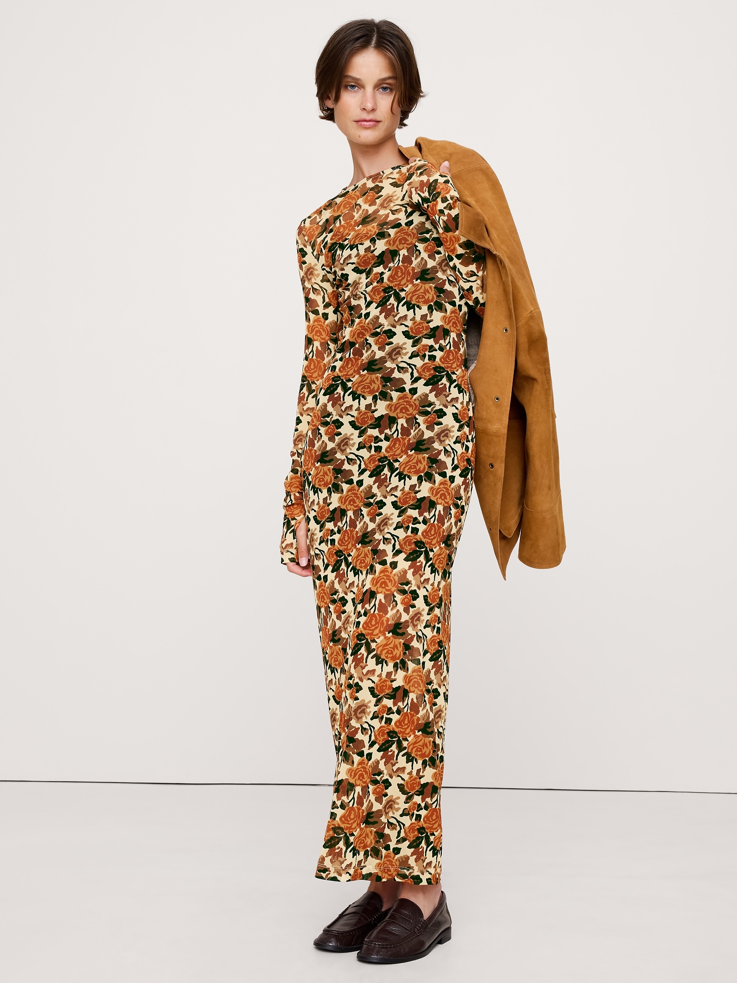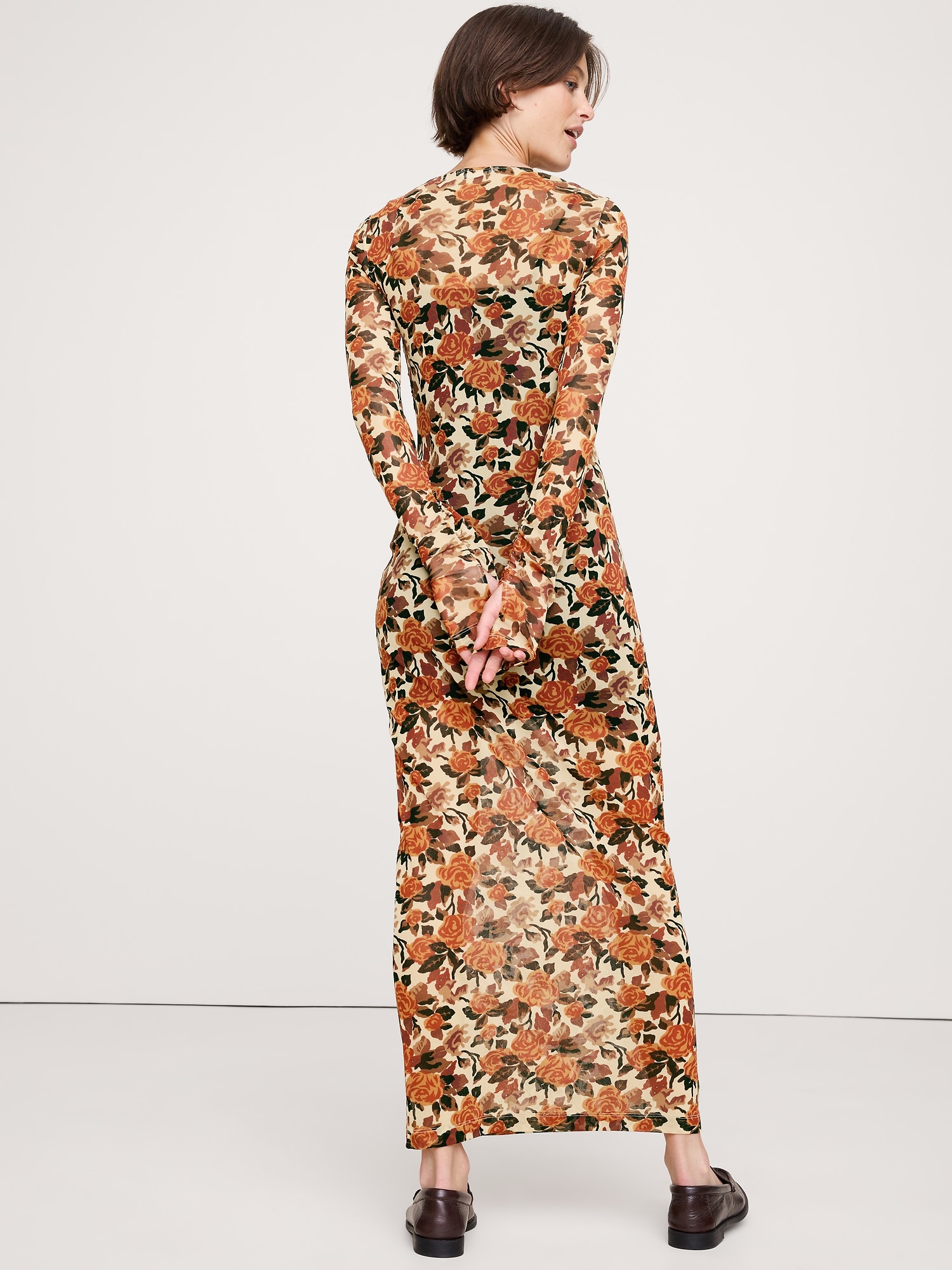 Things we love about this maxi dress: the semi-sheer mesh, the camisole slip lining, and the ultra-long sleeves with thumbholes. Plus, it’s super stretchy and t-shirt soft. Fitted: Sits close to the body with a straight skirt. Crew neck. Pull-on design. Camisole slip lining. #817760