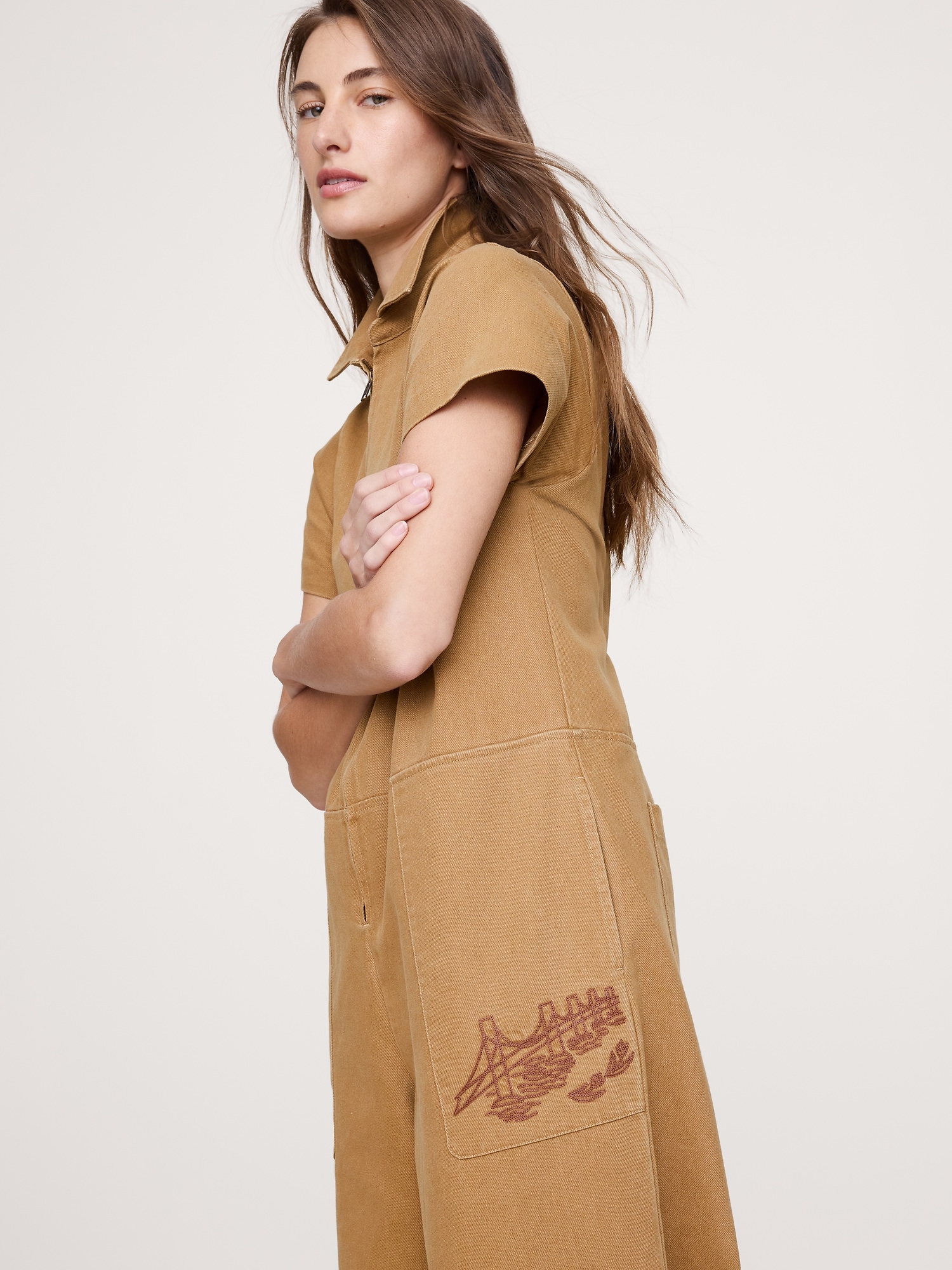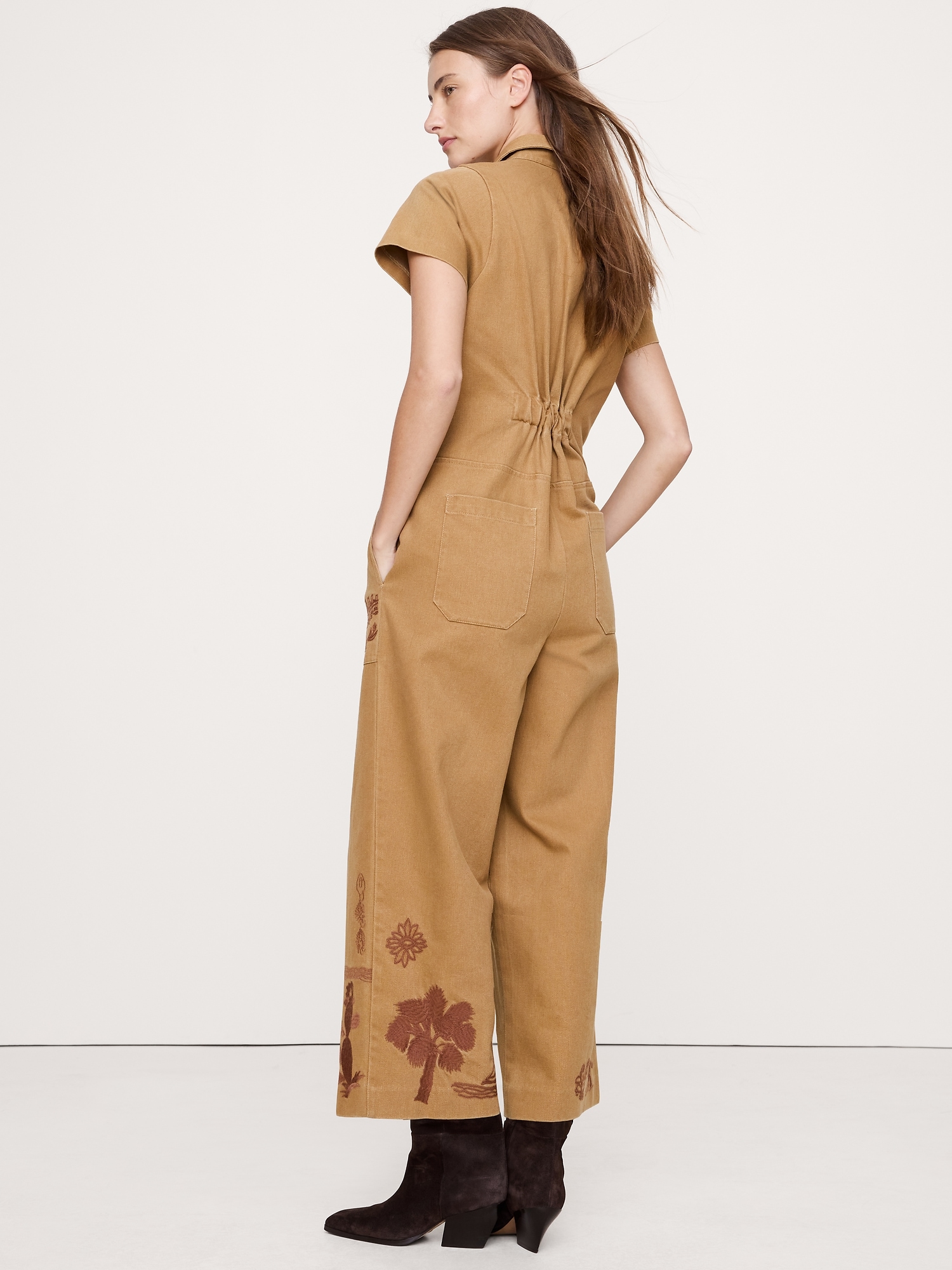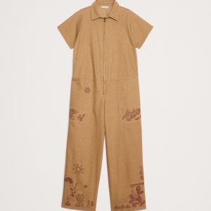 A design love, we cut this utility jumpsuit from sturdy, cotton canvas with a garment wash for softness. Look closely: the embroidery motifs were pulled from a vintage BR scarf of California icons.