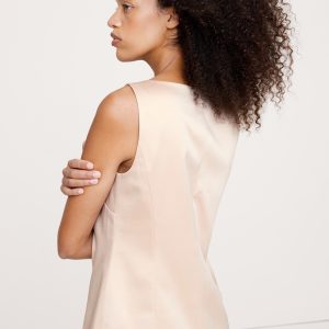 We cut this square-neck vest in a longer length with a square neckline, in a soft satin fabric. Make it a set with the matching kick-flare pant.