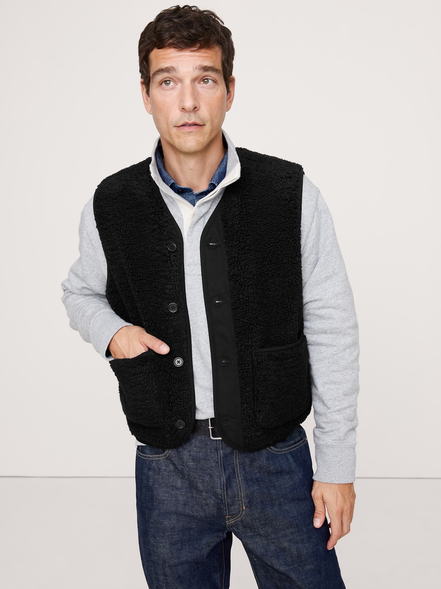 Cozy, contemporary, cool. We cut this vest in a relaxed silhouette (so it’s easy to layer) in our favorite sherpa fabric.