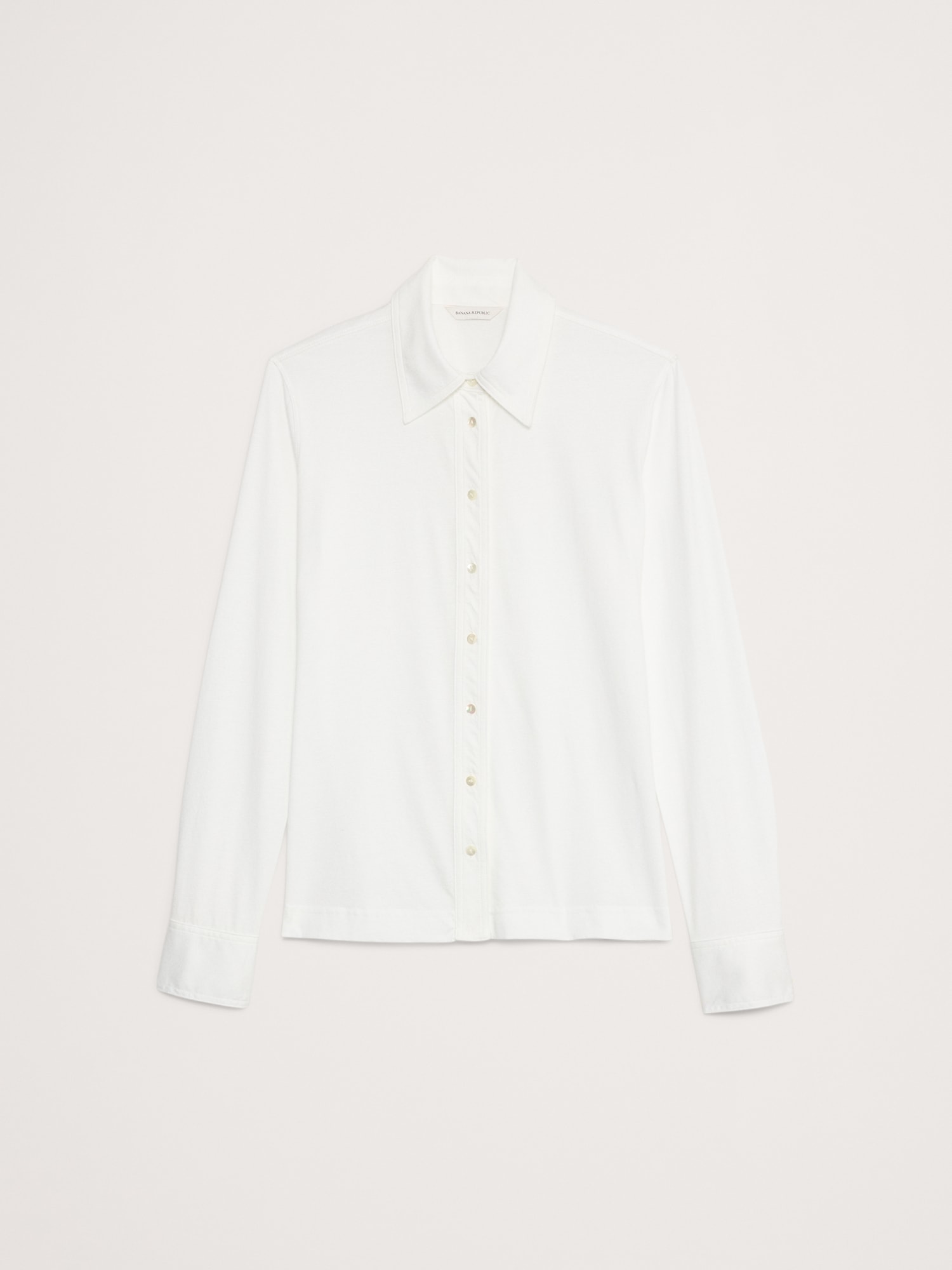 This timelessly tailored long-sleeve shirt is cut from our silky cotton jersey—a fabric we love for its beautiful drape and dressed-up look. Semi fitted. Point collar and button front. Straight hem. #543583
