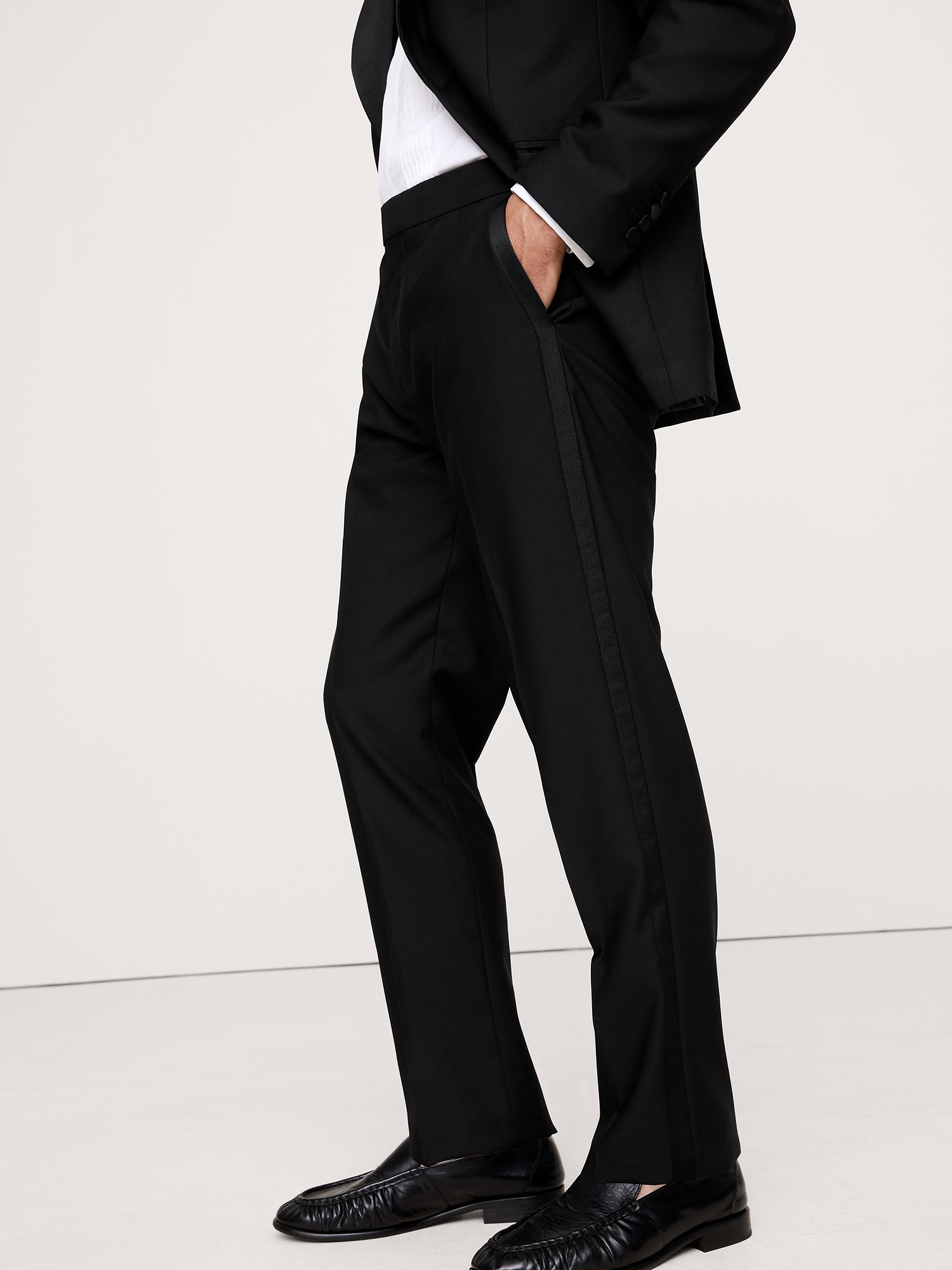 A tuxedo as special as the occasions it’ll see. Note: the Italian wool barathea fabric, the silk faille tuxedo stripe at the sides, and the crisp trouser crease (so they formal).