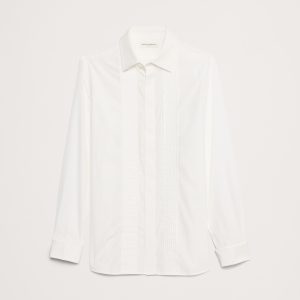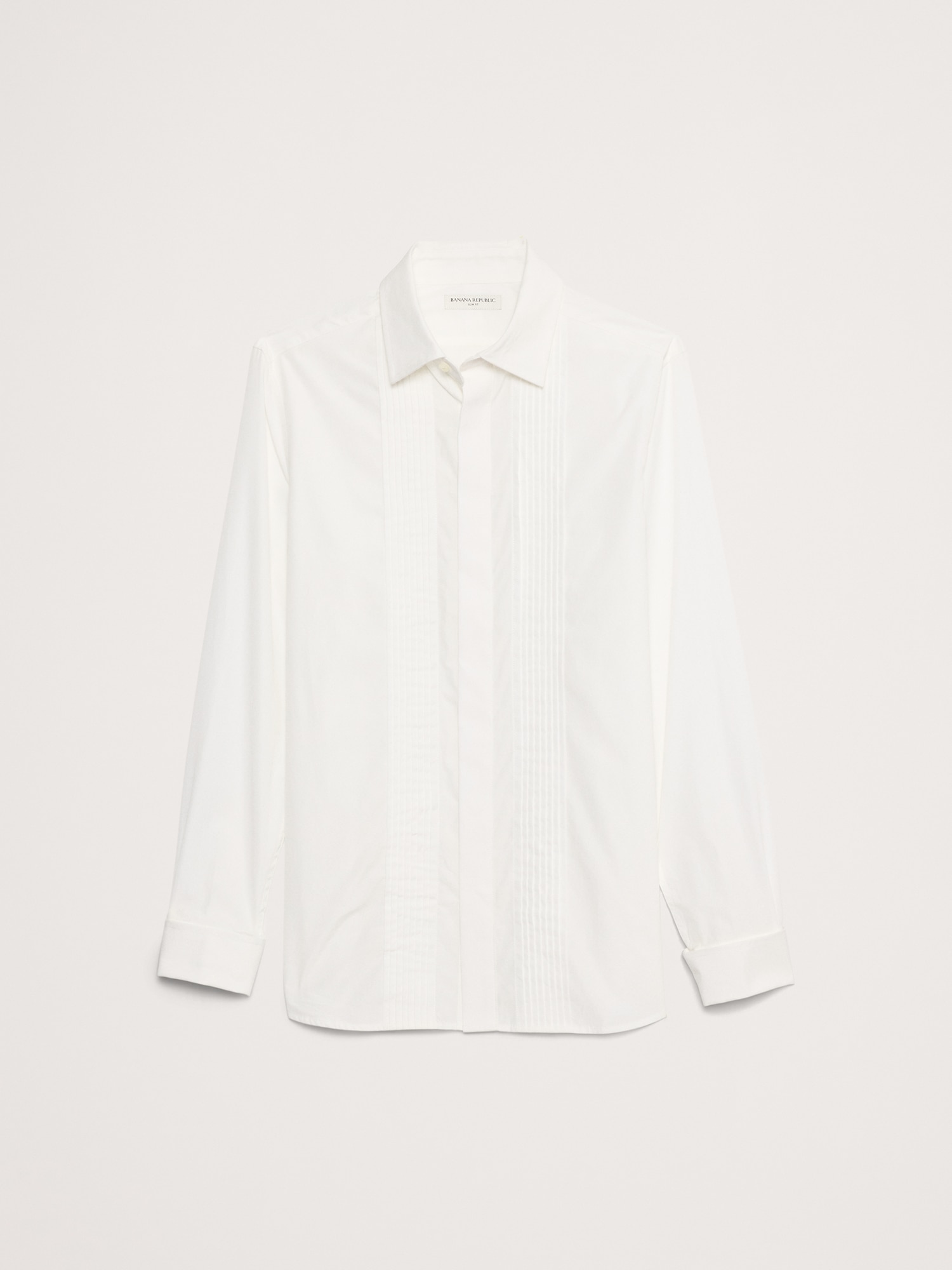This tuxedo dress shirt is cut from a premium cotton poplin, selected for its light structure, accented with the traditional pleated detail.