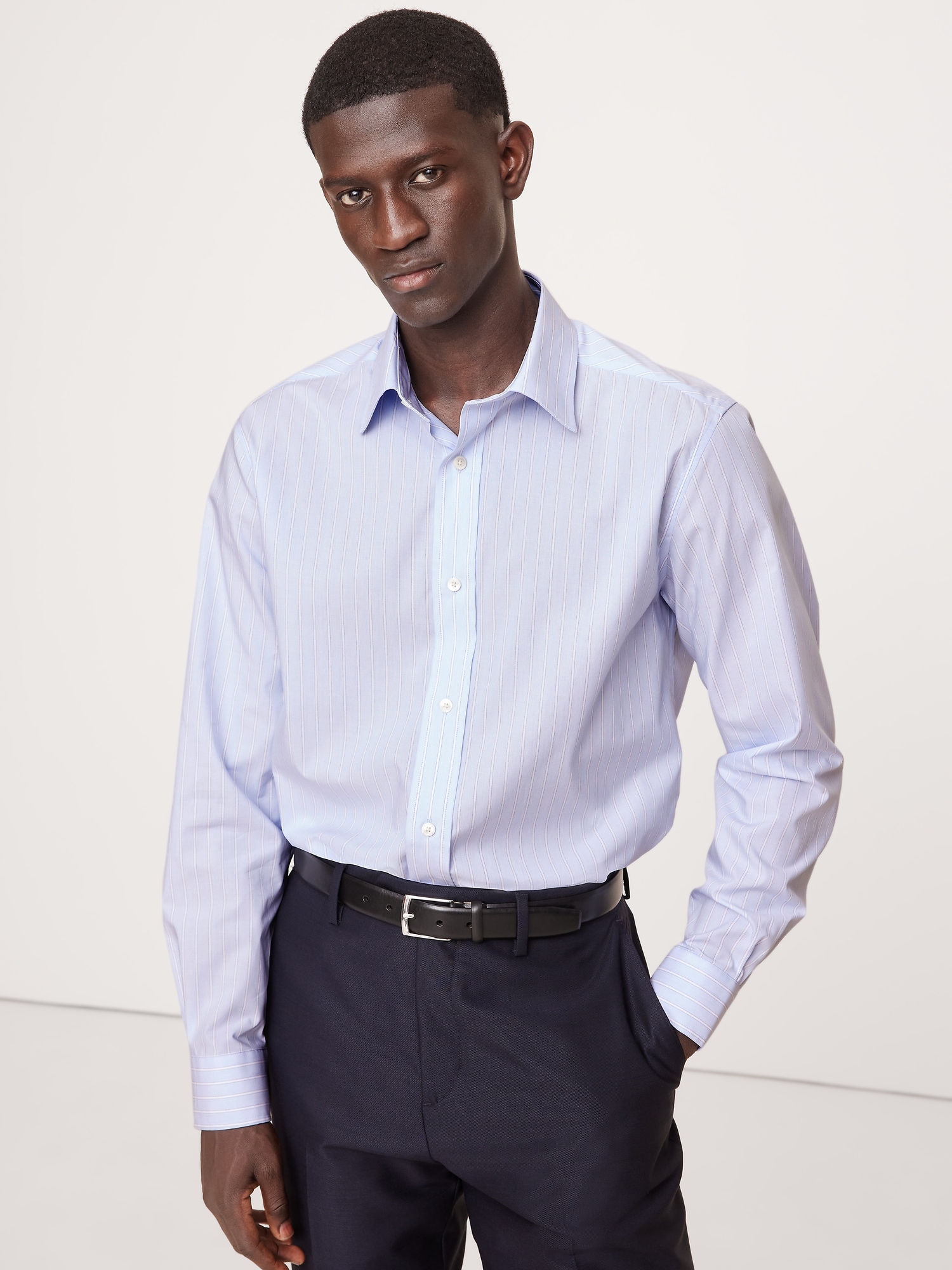 Designed for ease of wear and care, this sleek dress shirt employs a special cotton fabric with PUREPRESS™ cotton technology, a special process that smooths and protects the fabric, resulting in a finish.