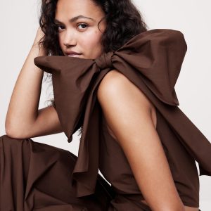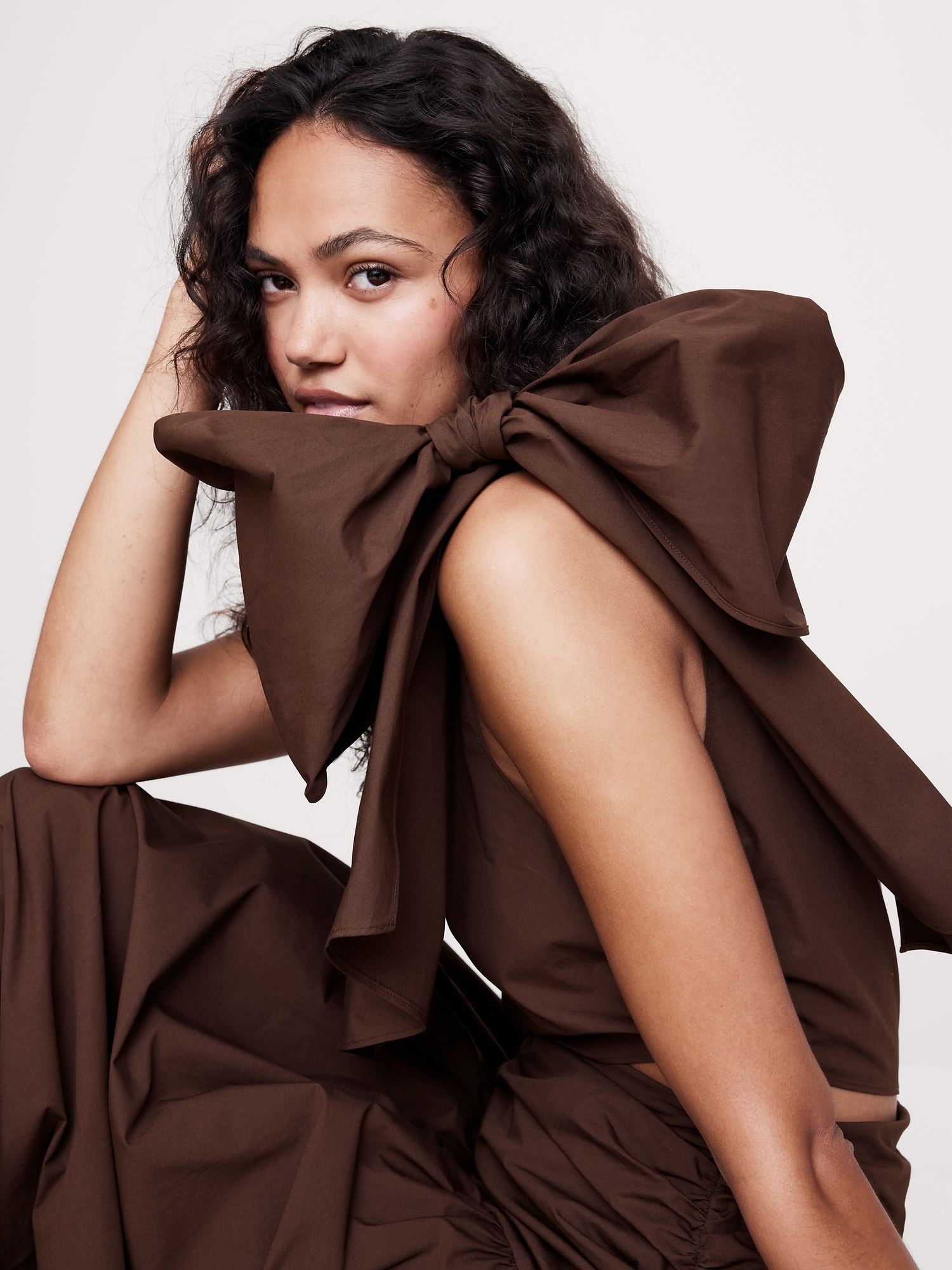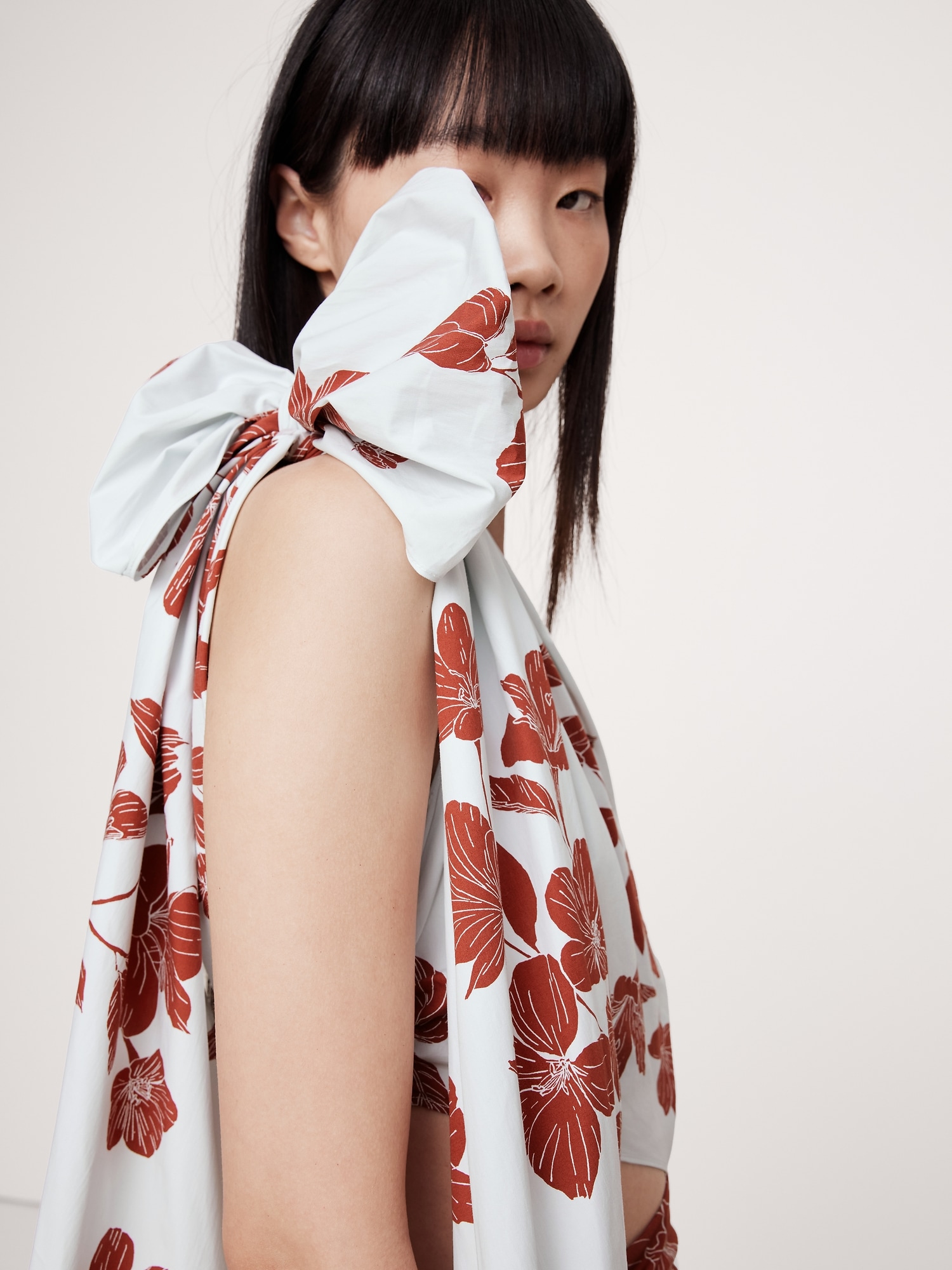 One-shoulder neckline with bow detail.