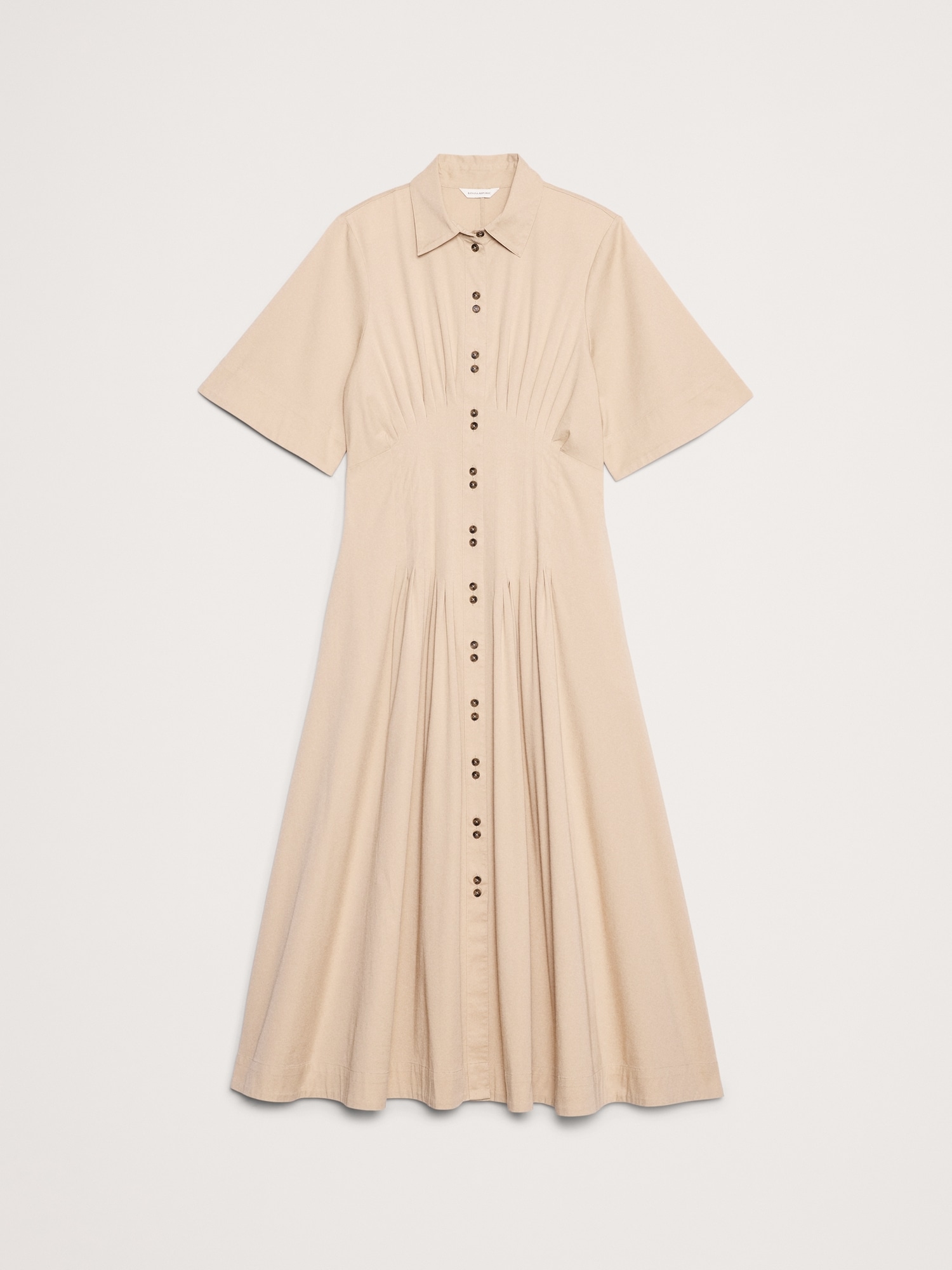 Stretch-Cotton Poplin Pintuck Long-Midi Shirt Dress